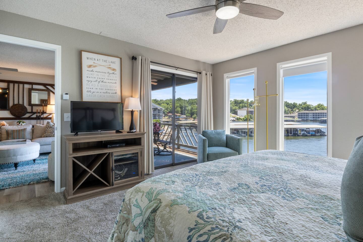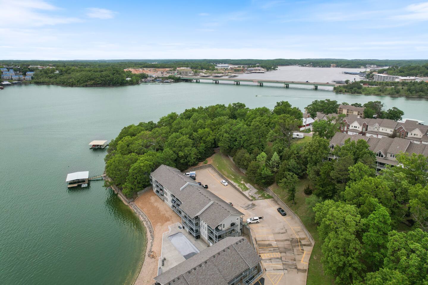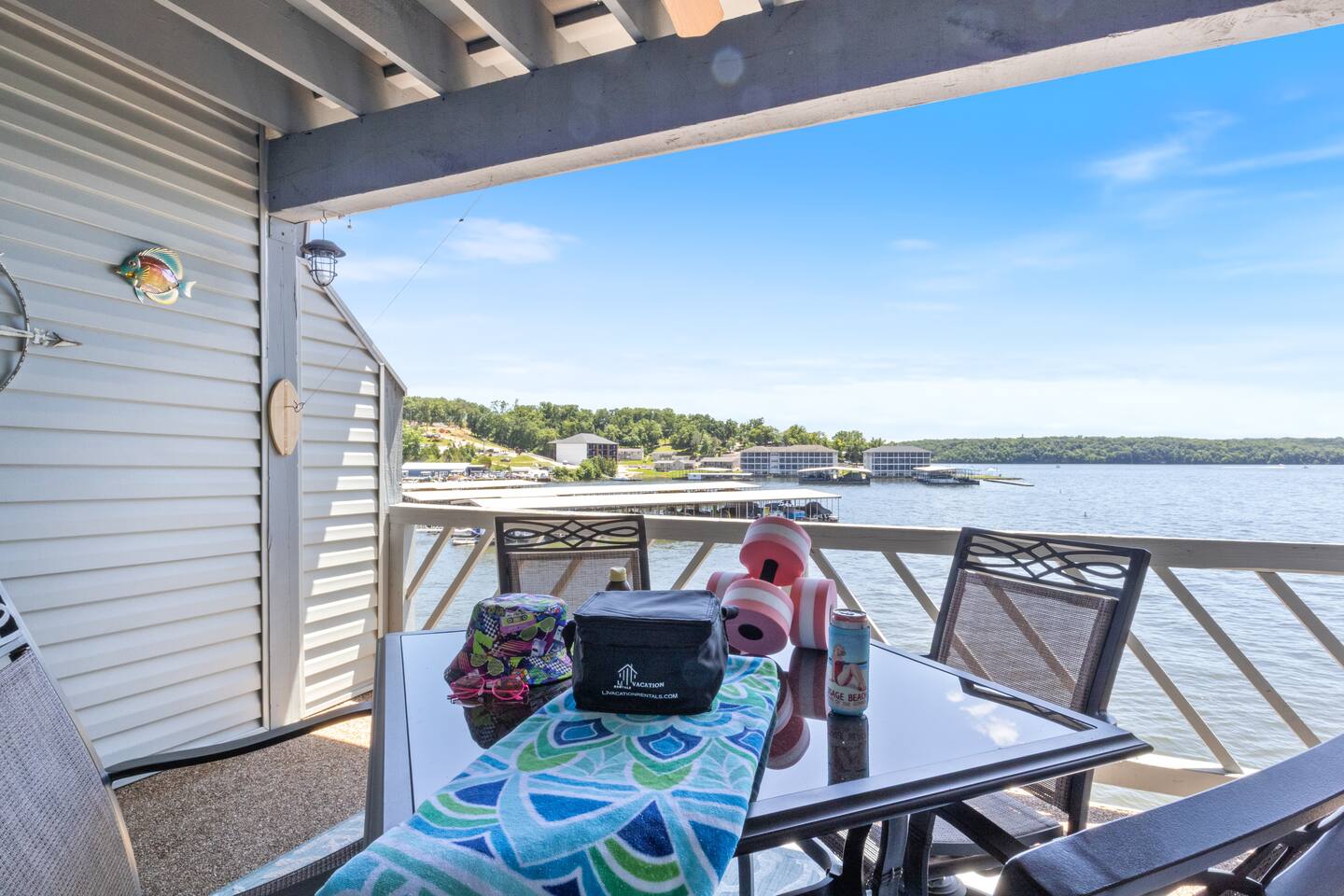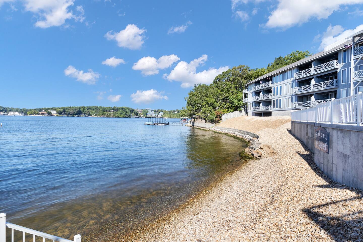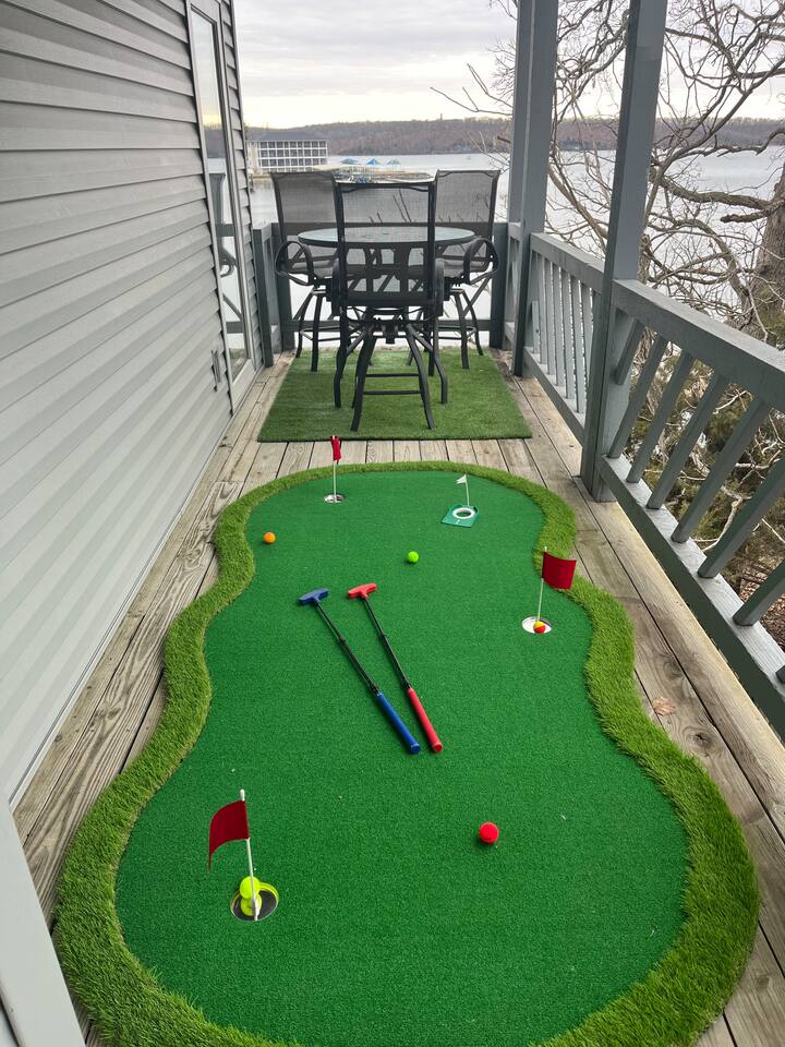 Welcome to Beachy Lakefront considered 1% of the very best of all eligible listings according to Airbnb's scoring – a private, end-unit retreat with no stairs, designed for a romantic getaway, a girls' weekend trip, a boys' fishing adventure, or a small family vacation. Located near mile marker 19 in the heart of Osage Beach, this stylish lakefront condo blends coastal charm with lakeside serenity for a truly unforgettable stay. As you step inside, you’ll be greeted by breathtaking, unobstructed lake views through expansive windows that fill the space with natural light. The open-concept living area features brand-new furnishings and a custom entertainment center housing a 65" smart TV and an electric fireplace, creating the perfect setting for quiet evenings or movie nights. Master Suite: Relax in the luxurious king-size bed while enjoying stunning lake views. The suite also features a flat-screen TV for your comfort. For restful nights, the room is outfitted with blackout blinds and curtains, ensuring a peaceful environment for sleep no matter the time of day. The attached bathroom has been recently updated offering a rejuvenating, spa-like walk-in shower and a lighted makeup mirror for added convenience. Second Bedroom: The second bedroom offers a queen-size bed, its own TV, and bedside lamps with built-in USB ports to keep your devices charged. The adjacent bathroom has been updated with a fresh, modern look, featuring a new tub and surround. Chef’s Kitchen: The kitchen is fully equipped with newer appliances and everything you need to prepare delicious meals, including a blender, crockpot, baking dishes, and more. Start your mornings with a freshly brewed cup of coffee from our dual Keurig coffee maker, offering both single-cup and carafe brewing options. Outdoor Living: Step outside and enjoy two private patios, both offering stunning lake views. The main patio is perfect for sipping your morning coffee or watching the sunset with a cocktail, complete with a covered patio, mini fridge, and comfortable seating. The side patio is equipped with an electric grill, ideal for outdoor cooking and a putting green to sharpen your skills, or have a little friendly competition. Grab a putter, line up your shot and enjoy a little extra entertainment during your stay! On-Site Amenities: The complex features a refreshing saltwater pool—an ideal alternative to lake swimming, with beautiful lake views as the backdrop. Please keep in mind that stairs are required for access. The pool is closed for the 2025 season and will reopen before Memorial Day. Centrally located, the condo is just minutes from local attractions, grocery stores, and boat rentals, making it easy to explore the area. With tasteful beachy decor and thoughtful updates throughout, Beachy Lakefront offers the perfect combination of coastal elegance and natural beauty, ensuring a relaxing and memorable experience. Whether you're seeking a romantic retreat, a fun weekend with friends, or a peaceful family vacation, this lakefront escape is designed to help you create lasting memories. PLEASE NOTE: No pets allowed and no smoking of any kind are permitted. A minimum fee of $250 will be applied for violations of these rules.