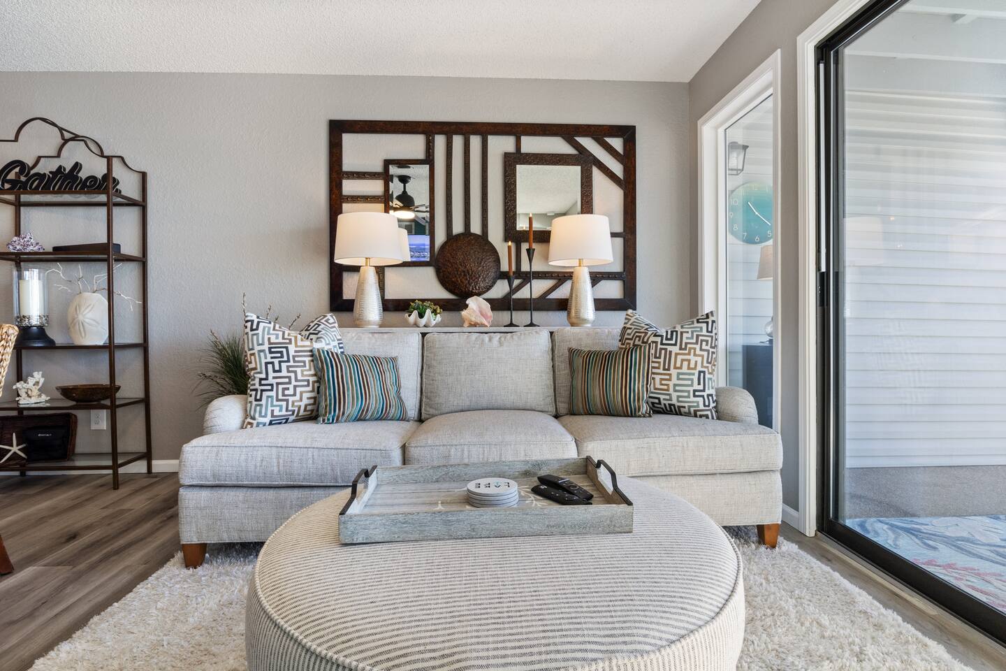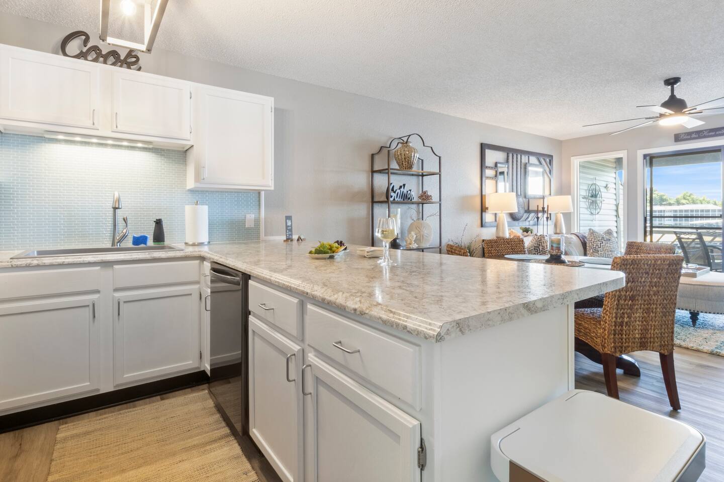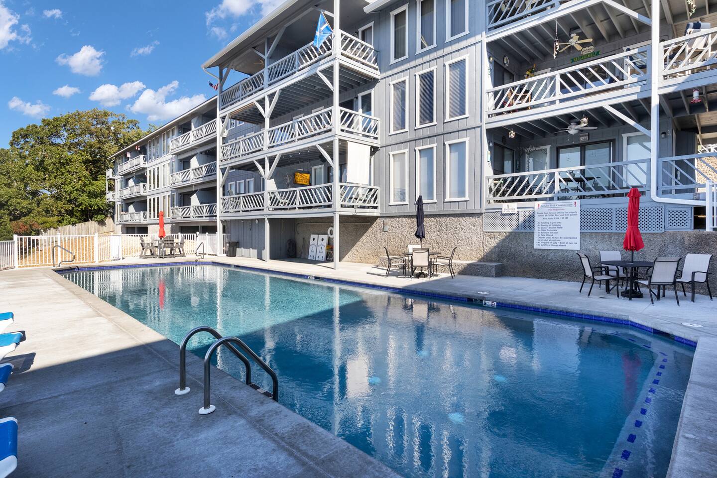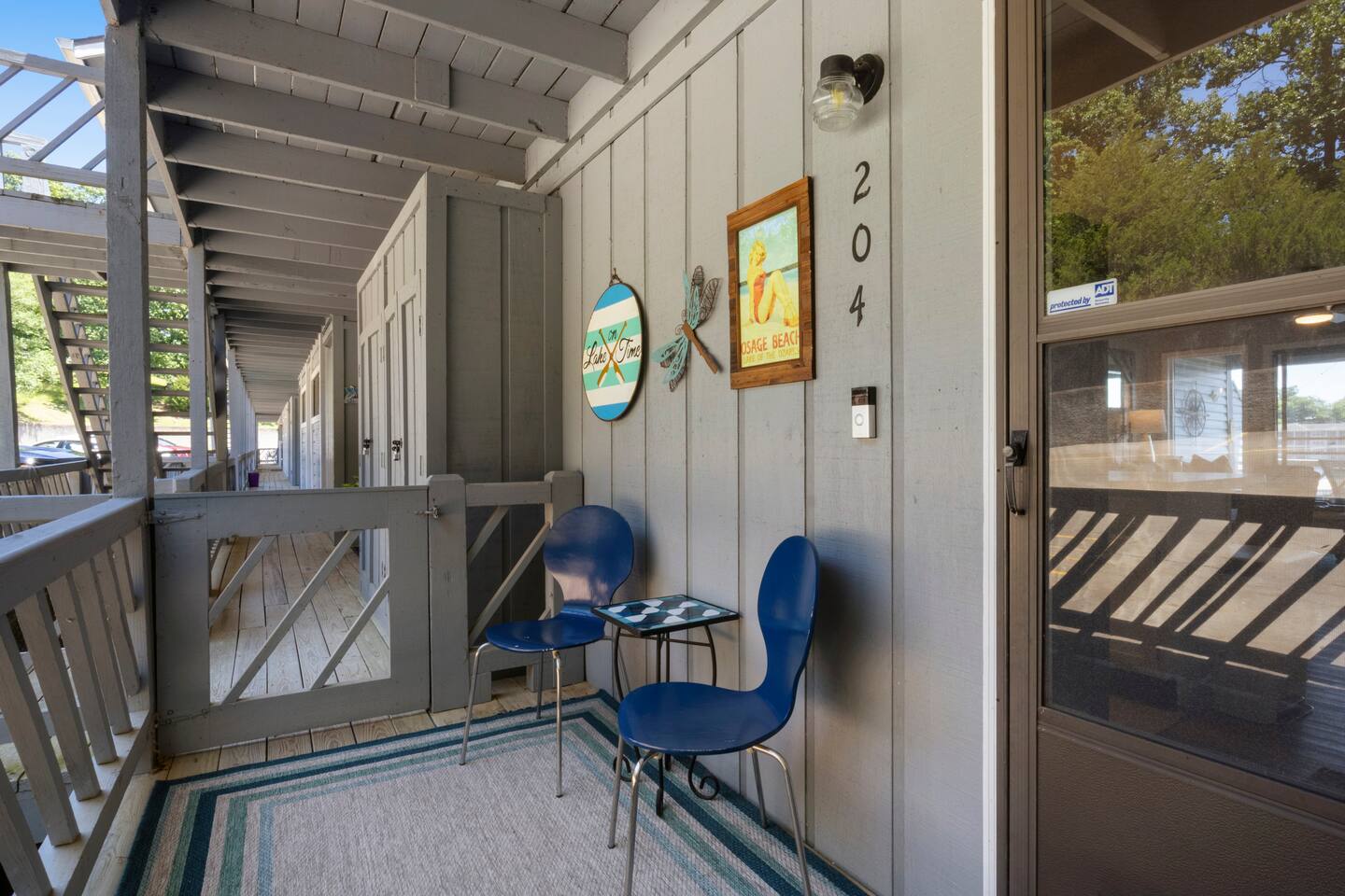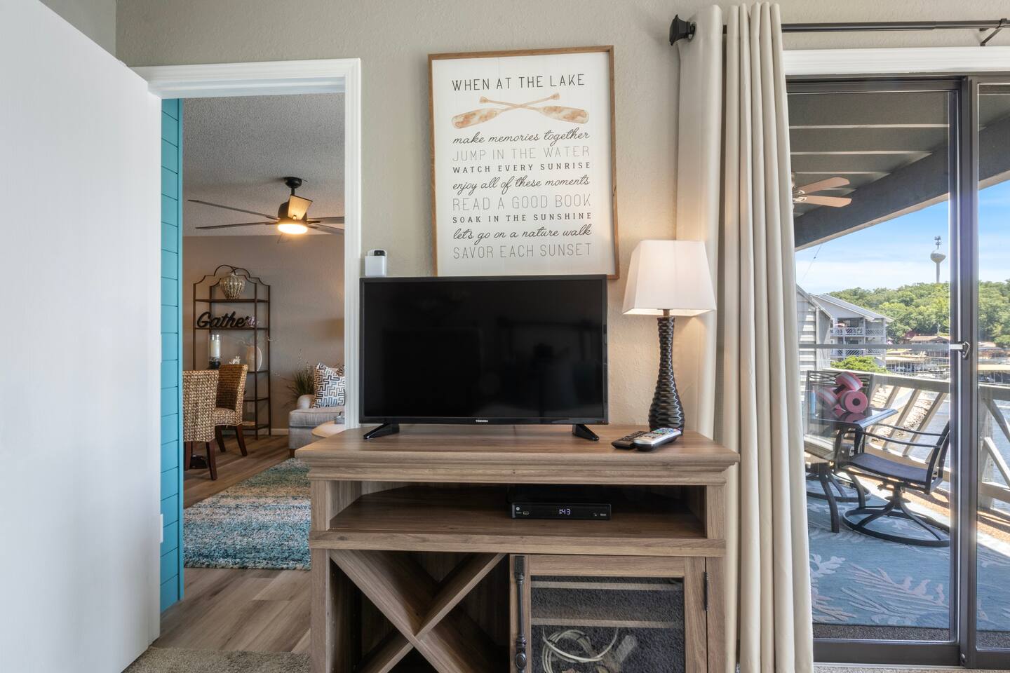 Welcome to Beachy Lakefront considered 1% of the very best of all eligible listings according to Airbnb's scoring – a private, end-unit retreat with no stairs, designed for a romantic getaway, a girls' weekend trip, a boys' fishing adventure, or a small family vacation. Located near mile marker 19 in the heart of Osage Beach, this stylish lakefront condo blends coastal charm with lakeside serenity for a truly unforgettable stay. As you step inside, you’ll be greeted by breathtaking, unobstructed lake views through expansive windows that fill the space with natural light. The open-concept living area features brand-new furnishings and a custom entertainment center housing a 65" smart TV and an electric fireplace, creating the perfect setting for quiet evenings or movie nights. Master Suite: Relax in the luxurious king-size bed while enjoying stunning lake views. The suite also features a flat-screen TV for your comfort. For restful nights, the room is outfitted with blackout blinds and curtains, ensuring a peaceful environment for sleep no matter the time of day. The attached bathroom has been recently updated offering a rejuvenating, spa-like walk-in shower and a lighted makeup mirror for added convenience. Second Bedroom: The second bedroom offers a queen-size bed, its own TV, and bedside lamps with built-in USB ports to keep your devices charged. The adjacent bathroom has been updated with a fresh, modern look, featuring a new tub and surround. Chef’s Kitchen: The kitchen is fully equipped with newer appliances and everything you need to prepare delicious meals, including a blender, crockpot, baking dishes, and more. Start your mornings with a freshly brewed cup of coffee from our dual Keurig coffee maker, offering both single-cup and carafe brewing options. Outdoor Living: Step outside and enjoy two private patios, both offering stunning lake views. The main patio is perfect for sipping your morning coffee or watching the sunset with a cocktail, complete with a covered patio, mini fridge, and comfortable seating. The side patio is equipped with an electric grill, ideal for outdoor cooking and a putting green to sharpen your skills, or have a little friendly competition. Grab a putter, line up your shot and enjoy a little extra entertainment during your stay! On-Site Amenities: The complex features a refreshing saltwater pool—an ideal alternative to lake swimming, with beautiful lake views as the backdrop. Please keep in mind that stairs are required for access. The pool is closed for the 2025 season and will reopen before Memorial Day. Centrally located, the condo is just minutes from local attractions, grocery stores, and boat rentals, making it easy to explore the area. With tasteful beachy decor and thoughtful updates throughout, Beachy Lakefront offers the perfect combination of coastal elegance and natural beauty, ensuring a relaxing and memorable experience. Whether you're seeking a romantic retreat, a fun weekend with friends, or a peaceful family vacation, this lakefront escape is designed to help you create lasting memories. PLEASE NOTE: No pets allowed and no smoking of any kind are permitted. A minimum fee of $250 will be applied for violations of these rules.