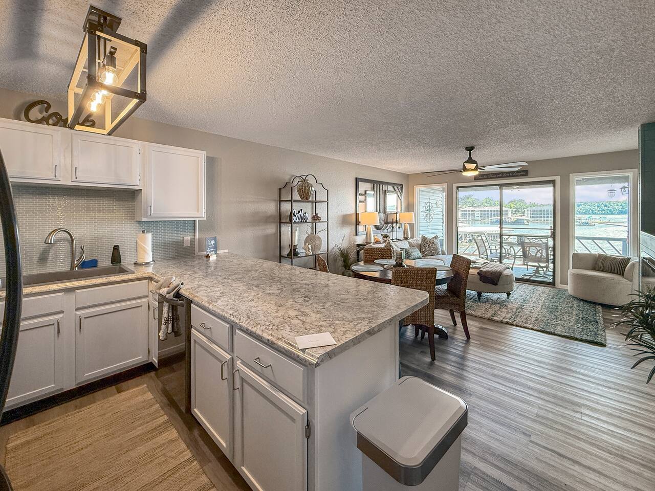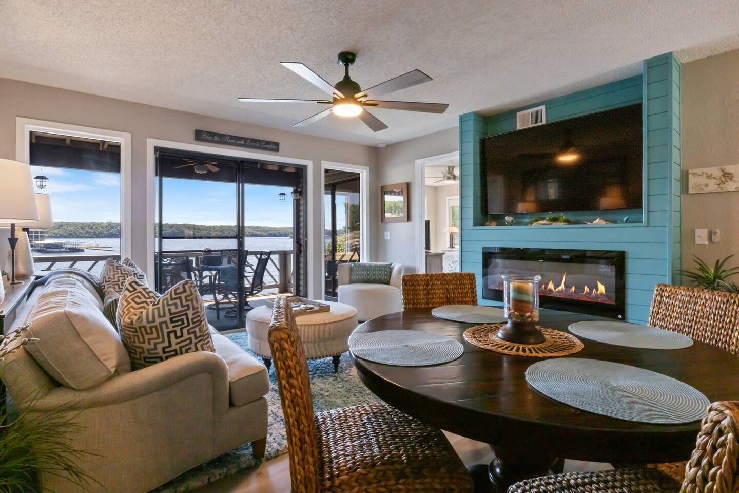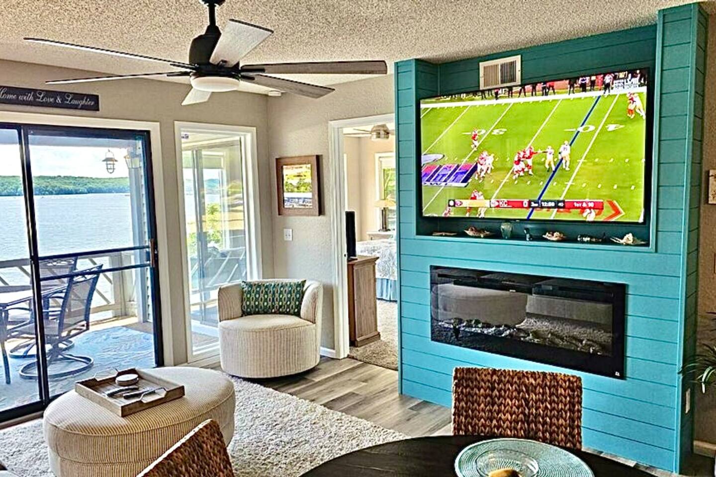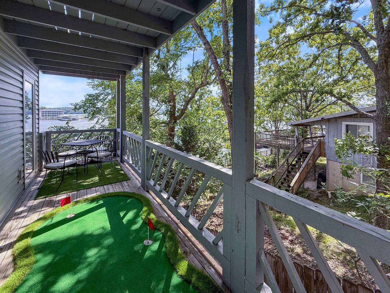Lakefront*Unobstructed Views*Newly Remodeled*New Furnishings*Covered Patio*Electric Fireplace*Putting Green*65” Smart TV*King & Queen Size Beds*Updated Bathrooms*Easy Access/No Stairs* • Traveling with friends or need more room to spread out? We've got you covered. Just upstairs, we also host a separate 1-bedroom, 1-bath unit with its own shuffleboard, covered patio, and the same incredible lakefront views - perfect for a group trip while still enjoying your own space.