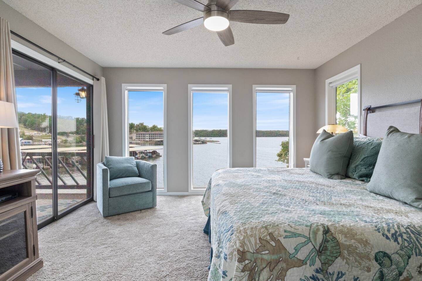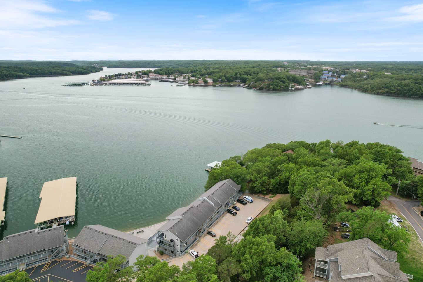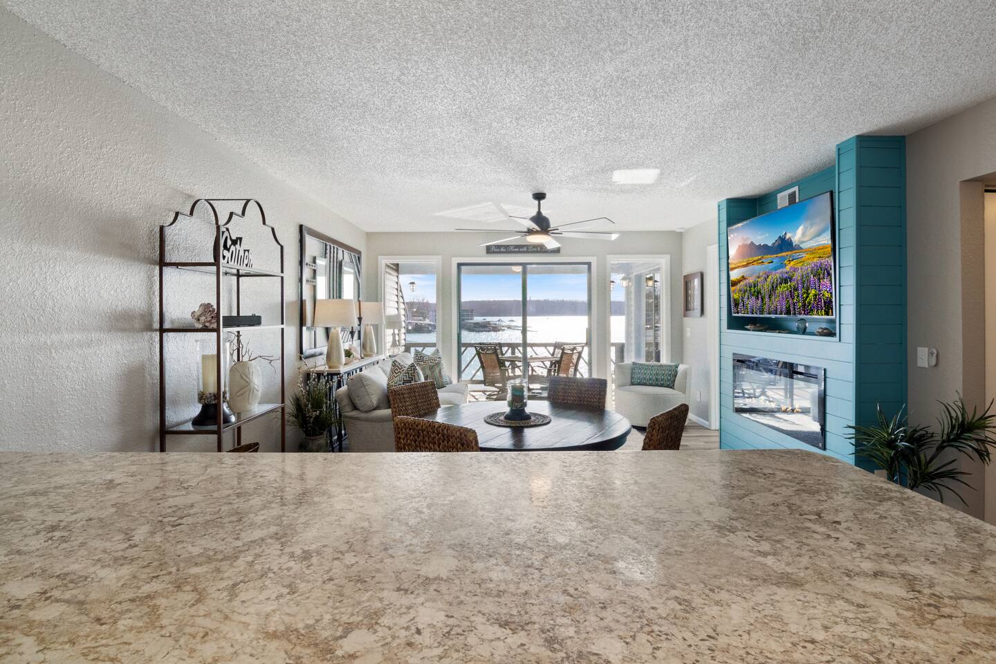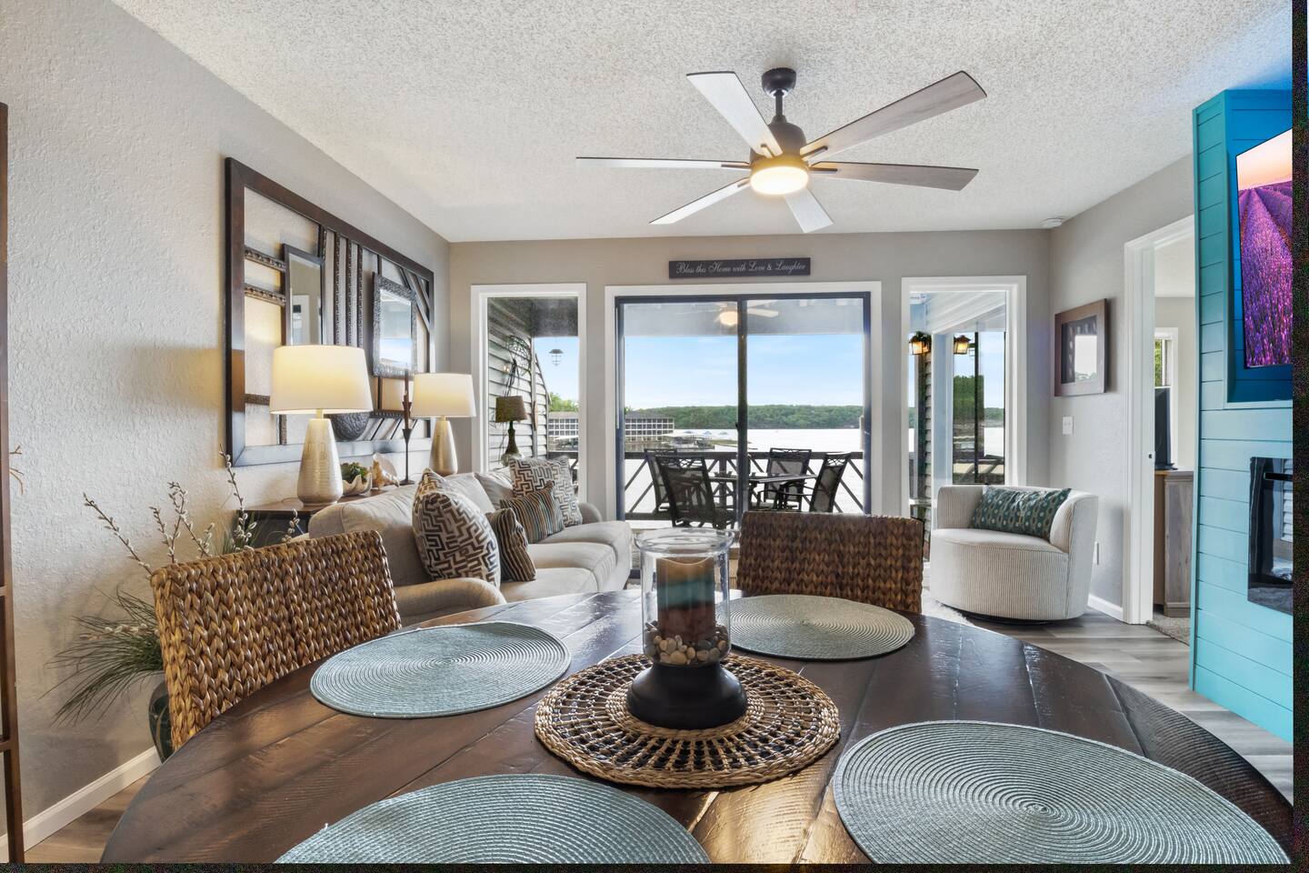 Lakefront*Unobstructed Views*Newly Remodeled*New Furnishings*Covered Patio*Electric Fireplace*Putting Green*65” Smart TV*King & Queen Size Beds*Updated Bathrooms*Easy Access/No Stairs* • Traveling with friends or need more room to spread out? We've got you covered. Just upstairs, we also host a separate 1-bedroom, 1-bath unit with its own shuffleboard, covered patio, and the same incredible lakefront views - perfect for a group trip while still enjoying your own space.