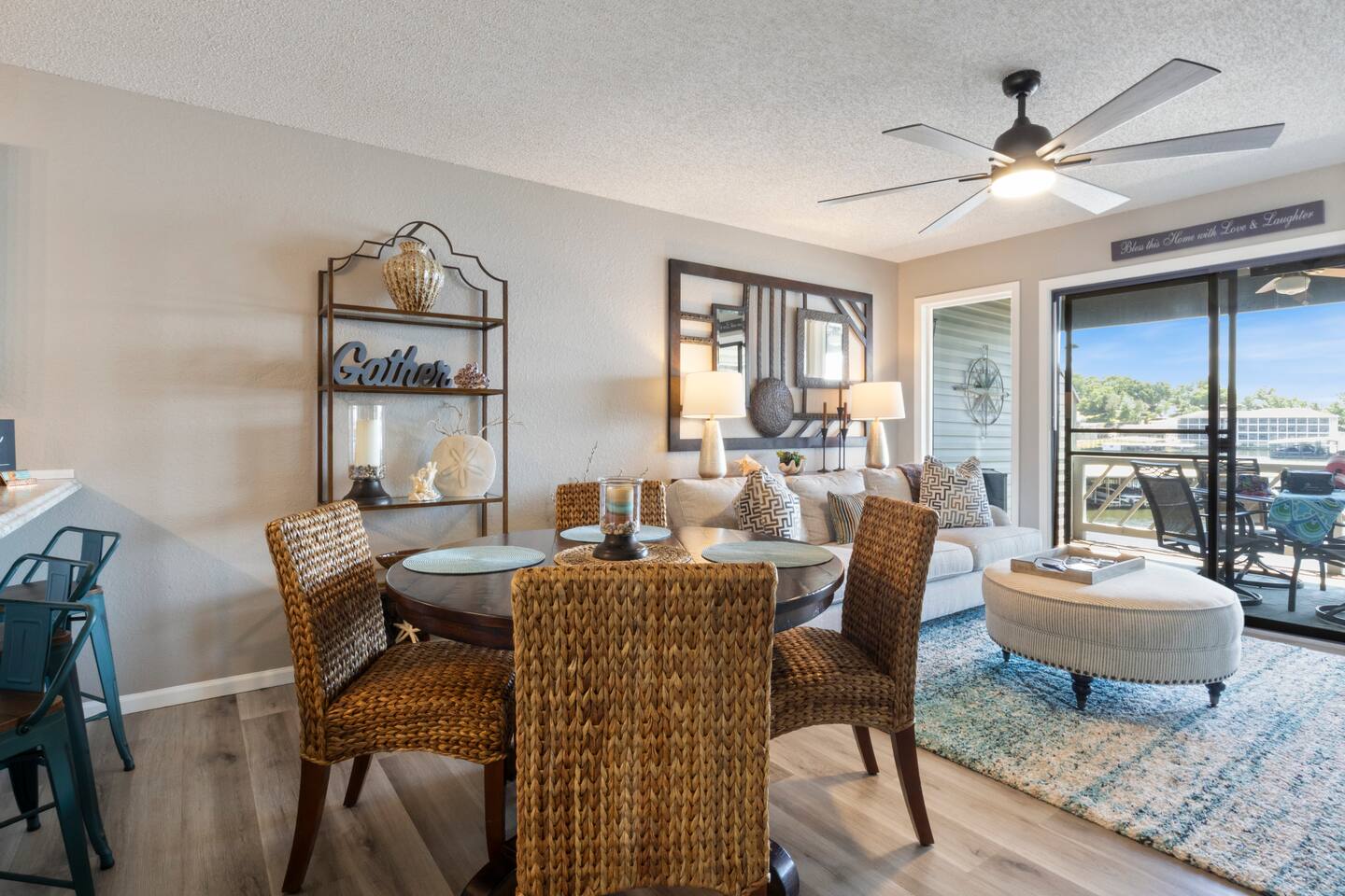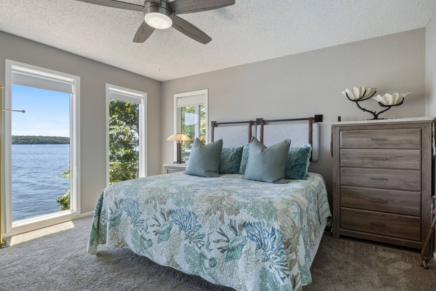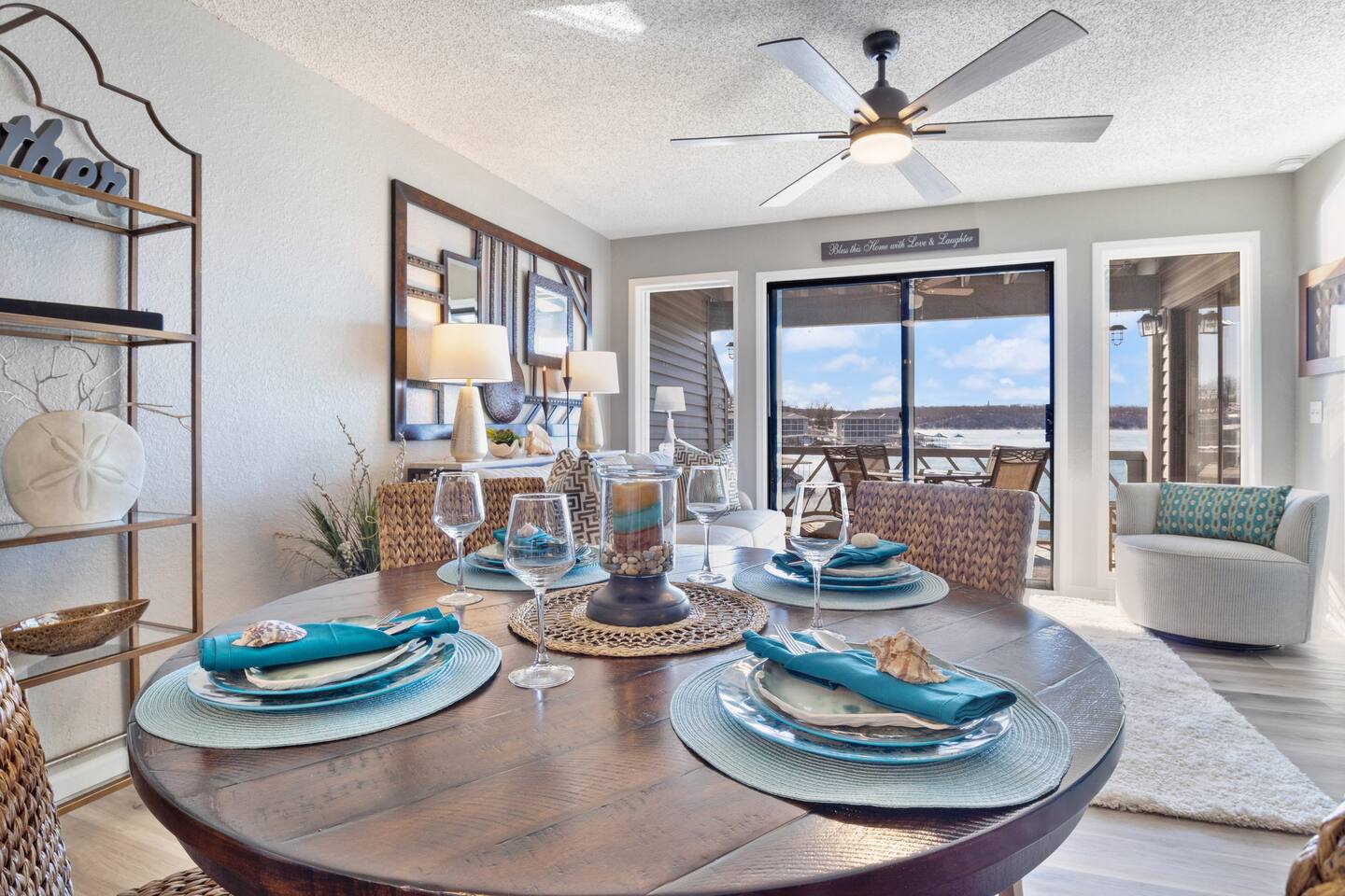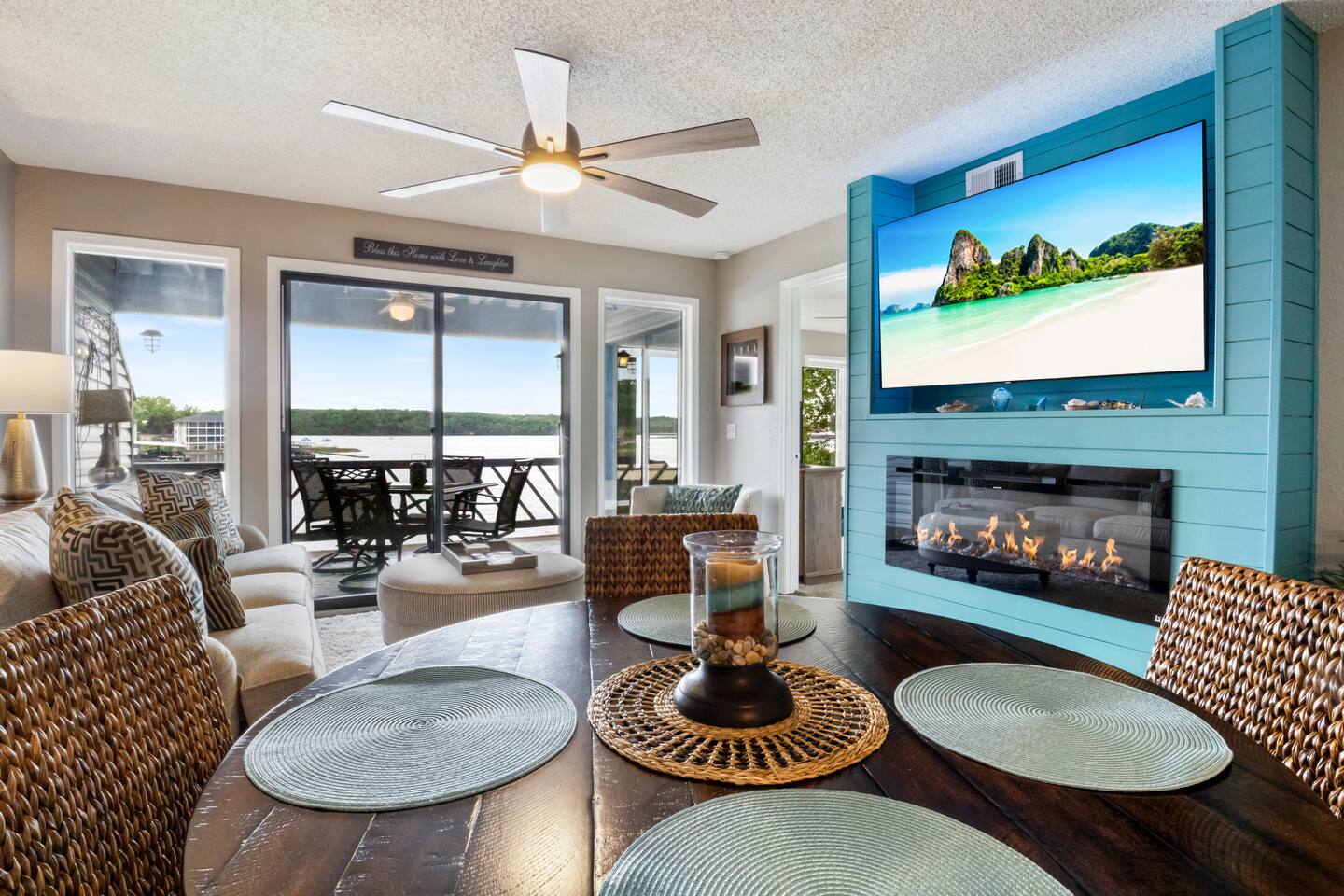 Lakefront*Unobstructed Views*Newly Remodeled*New Furnishings*Covered Patio*Electric Fireplace*Putting Green*65” Smart TV*King & Queen Size Beds*Updated Bathrooms*Easy Access/No Stairs* • Traveling with friends or need more room to spread out? We've got you covered. Just upstairs, we also host a separate 1-bedroom, 1-bath unit with its own shuffleboard, covered patio, and the same incredible lakefront views - perfect for a group trip while still enjoying your own space.