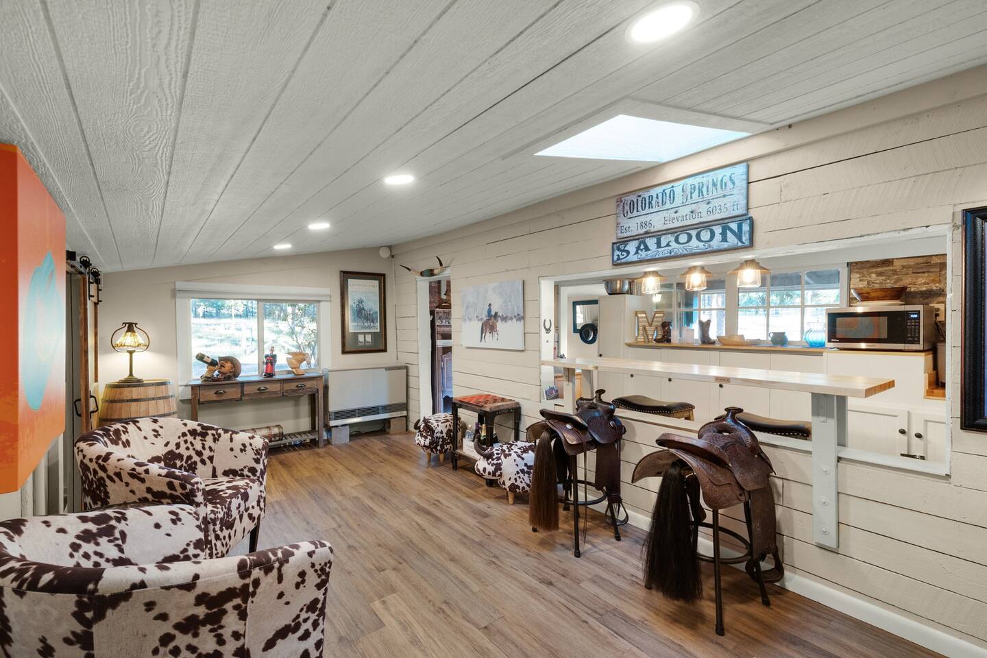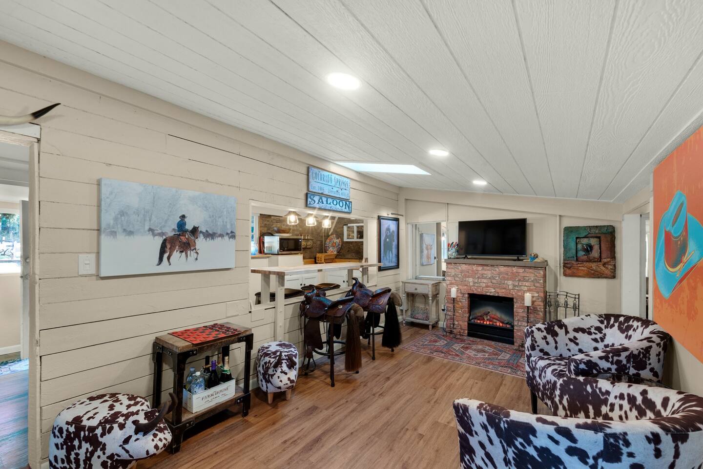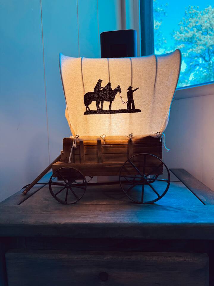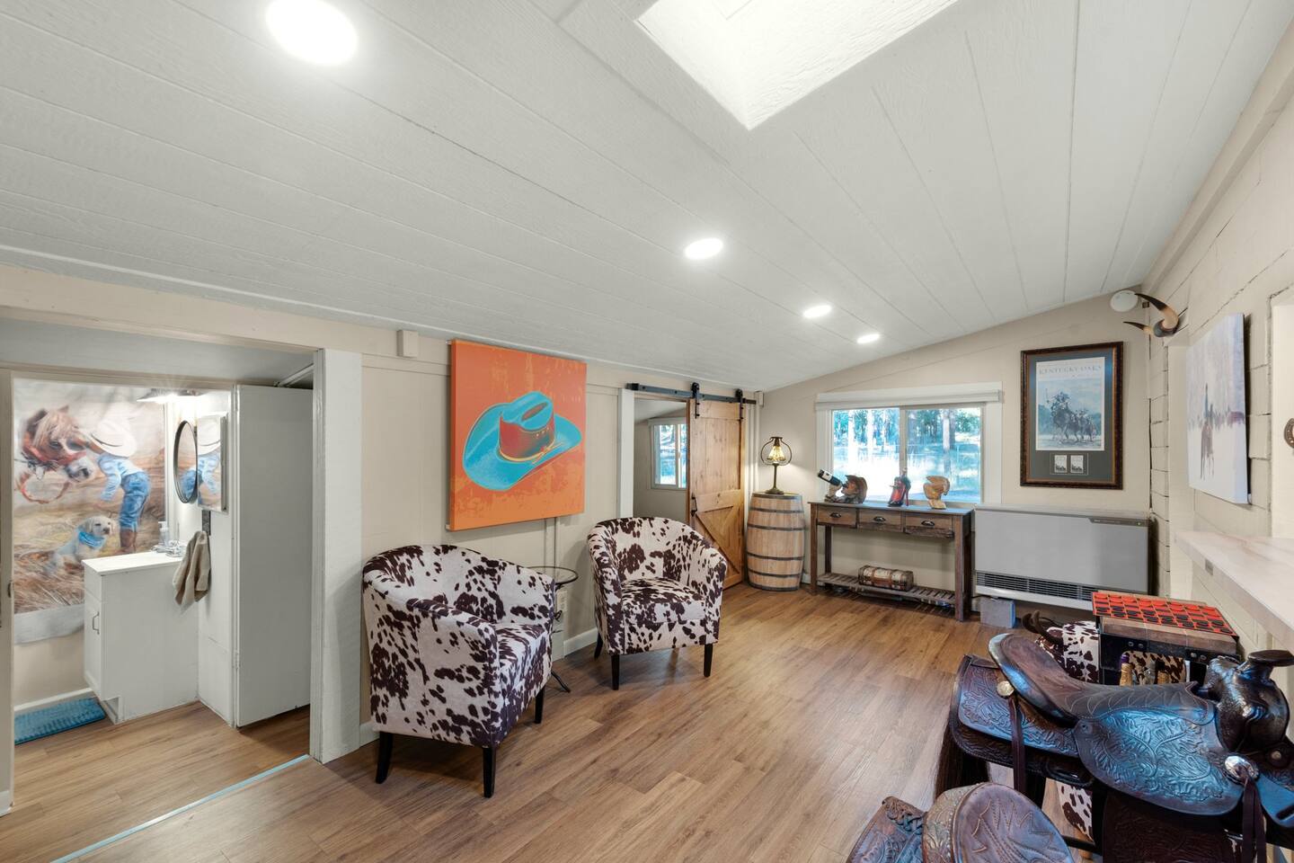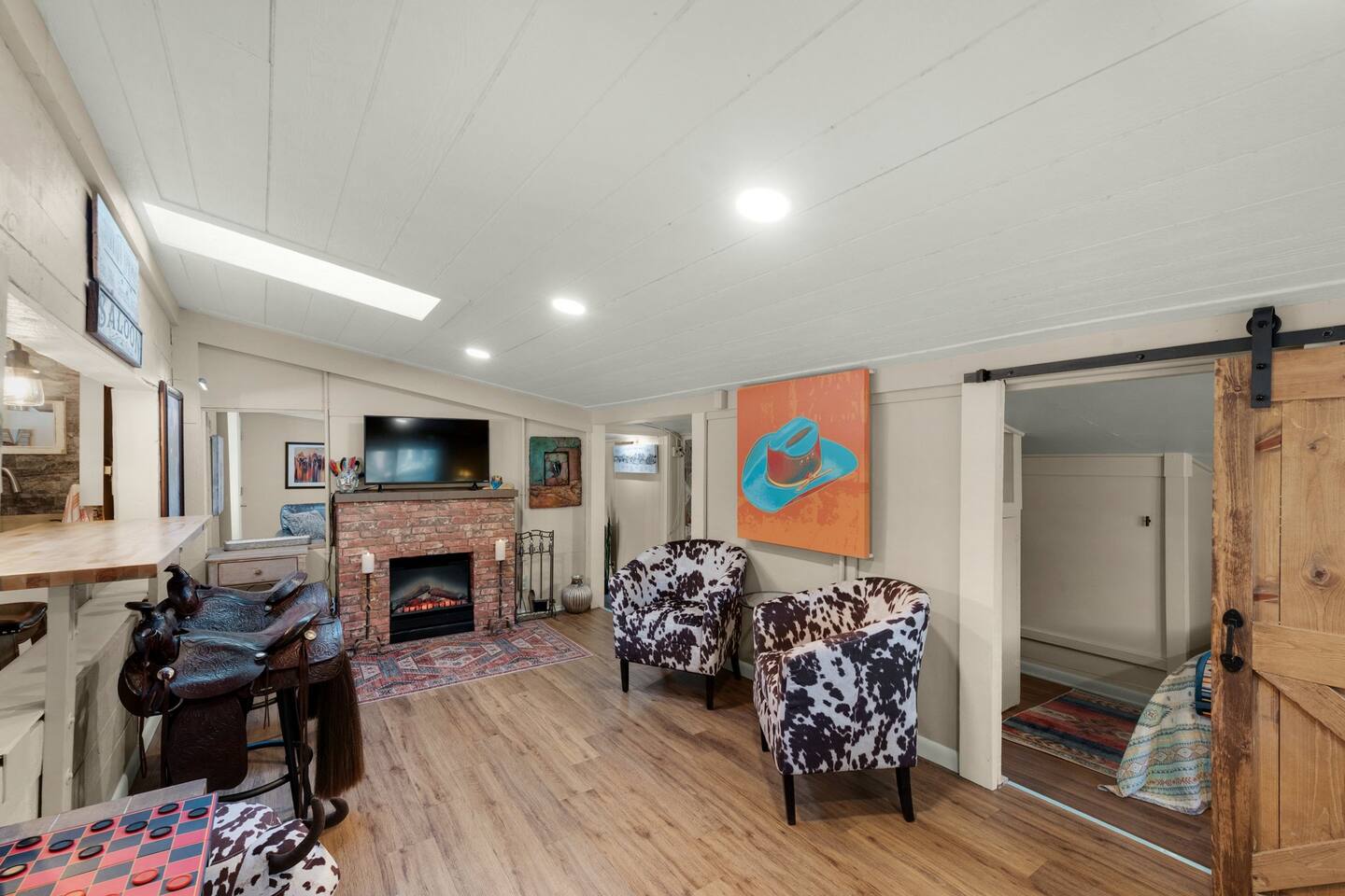 Step inside and you’ll find a space thoughtfully designed to reflect a western lifestyle, with cowhide chairs, saddle stools, and charming western touches throughout. The living room has an electric fireplace for cozy evenings, and the dining area — surrounded by windows — looks out over the pasture, making every meal or card game something special. The adjacent saloon room brings the Old West to life with its authentic décor, bar, and a second electric fireplace — perfect for telling stories, laughing late into the night, or simply soaking in the unique setting.