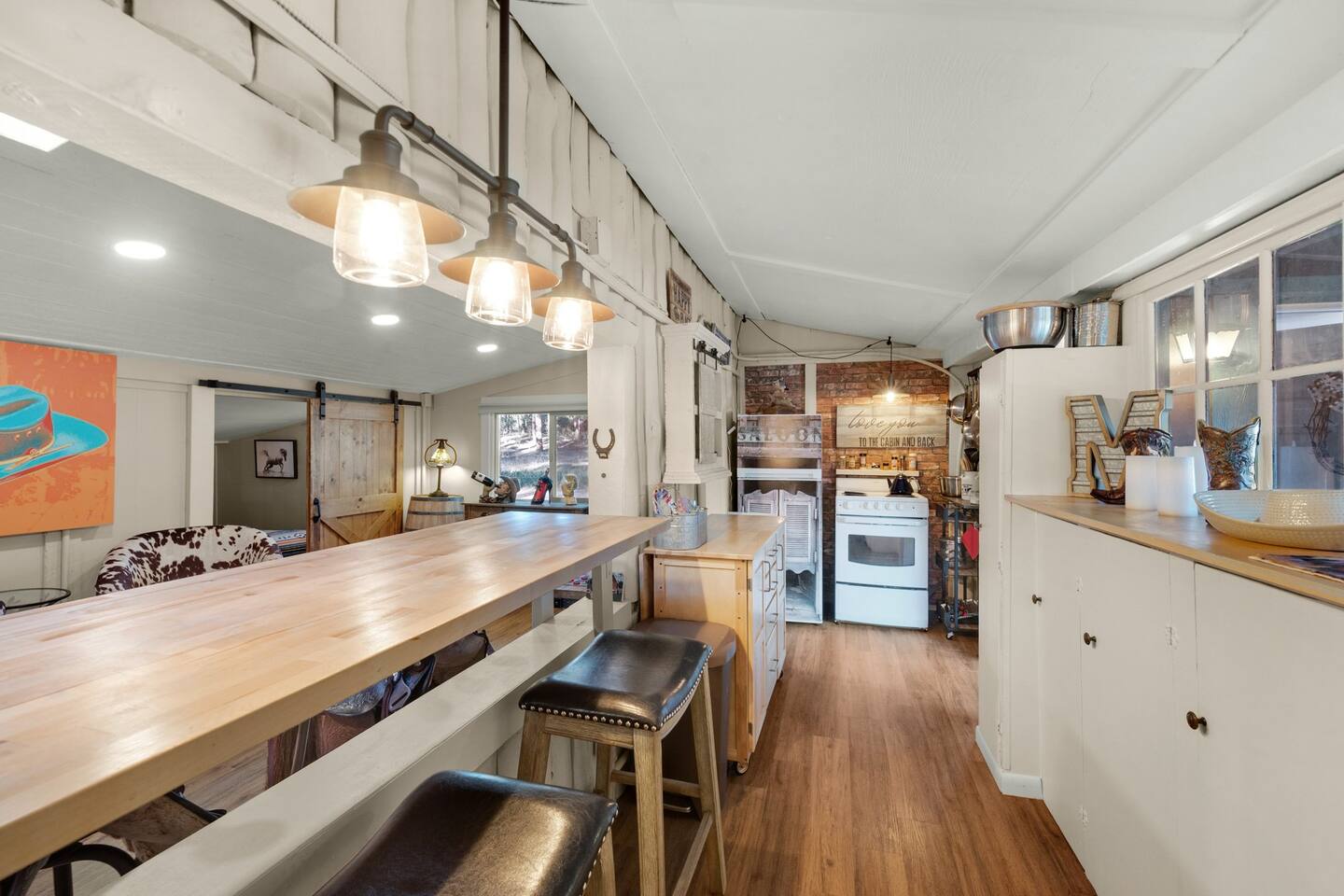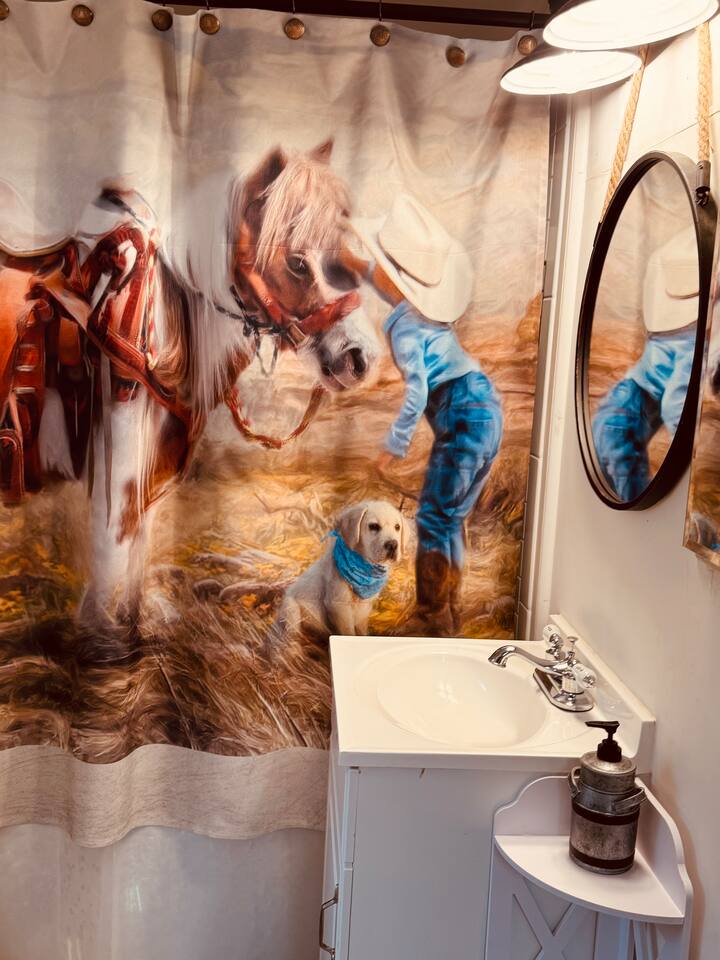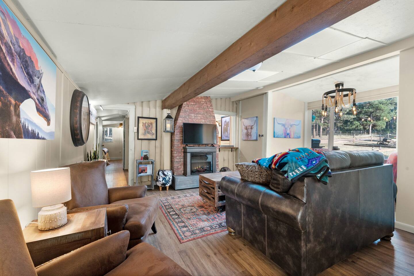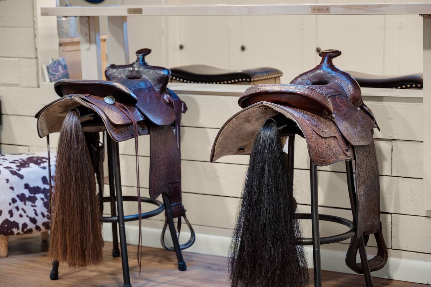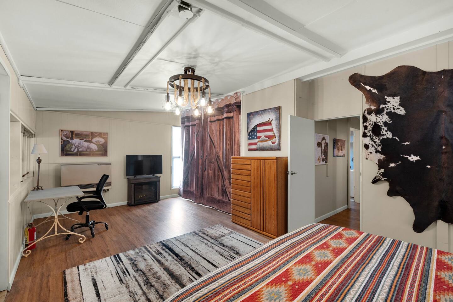 Step inside and you’ll find a space thoughtfully designed to reflect a western lifestyle, with cowhide chairs, saddle stools, and charming western touches throughout. The living room has an electric fireplace for cozy evenings, and the dining area — surrounded by windows — looks out over the pasture, making every meal or card game something special. The adjacent saloon room brings the Old West to life with its authentic décor, bar, and a second electric fireplace — perfect for telling stories, laughing late into the night, or simply soaking in the unique setting.