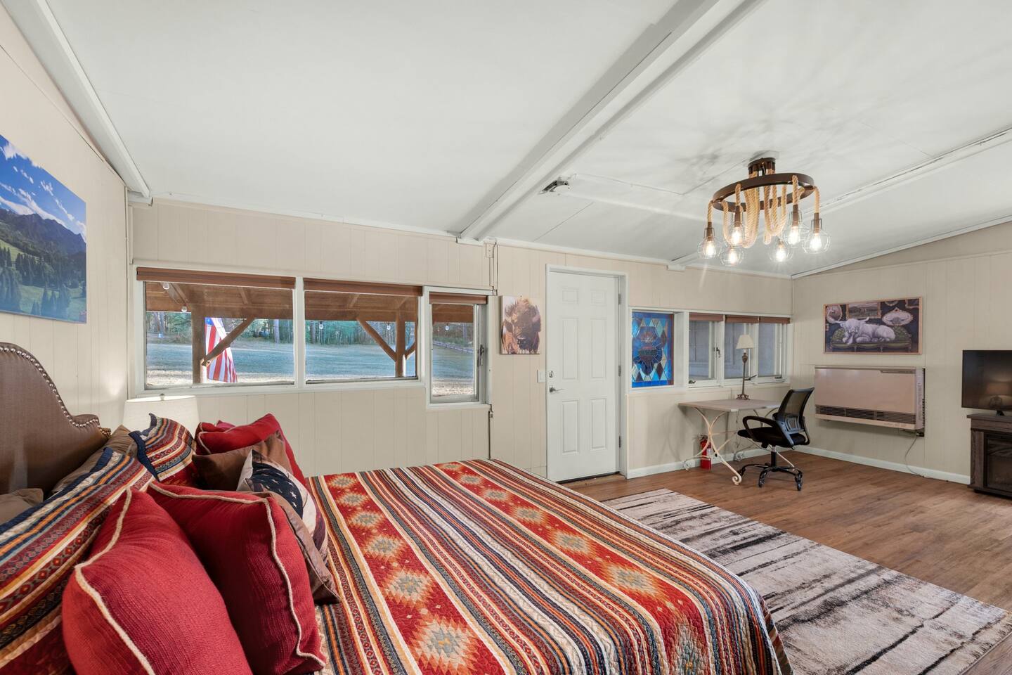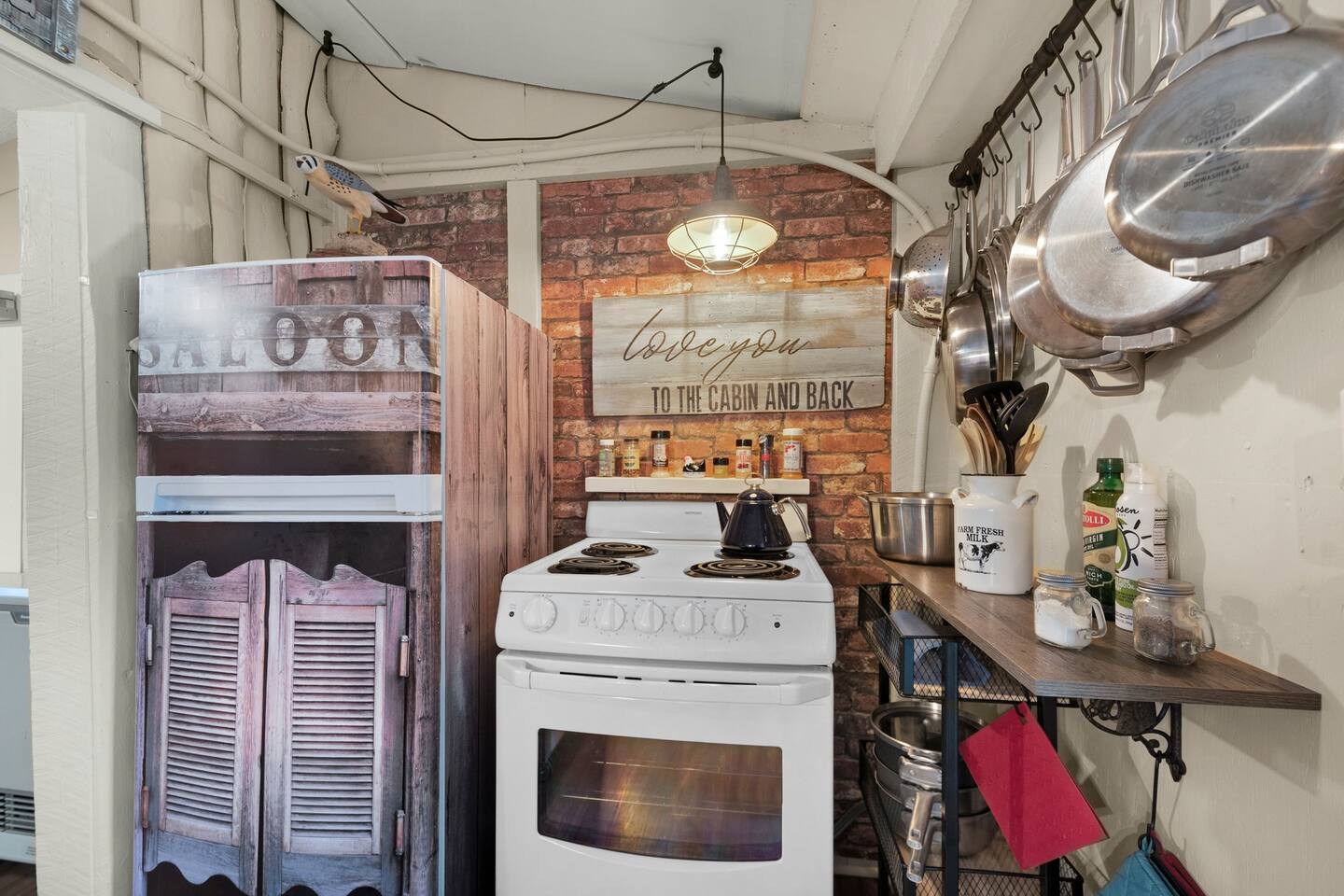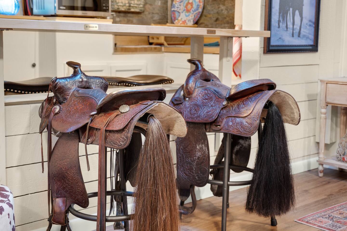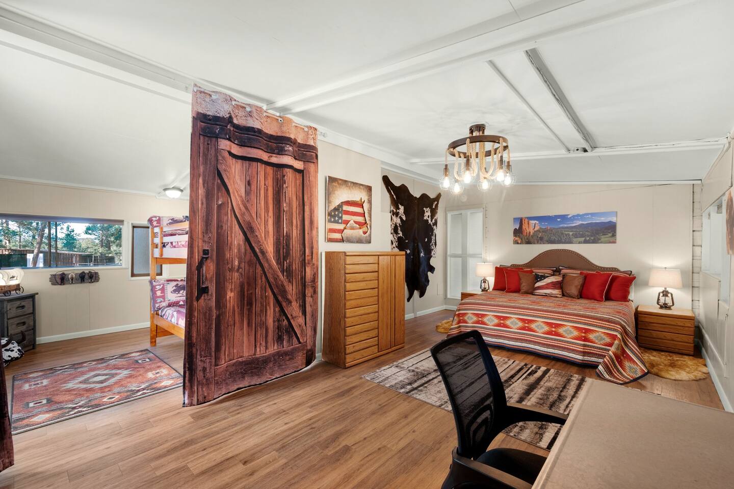 Step inside and you’ll find a space thoughtfully designed to reflect a western lifestyle, with cowhide chairs, saddle stools, and charming western touches throughout. The living room has an electric fireplace for cozy evenings, and the dining area — surrounded by windows — looks out over the pasture, making every meal or card game something special. The adjacent saloon room brings the Old West to life with its authentic décor, bar, and a second electric fireplace — perfect for telling stories, laughing late into the night, or simply soaking in the unique setting.