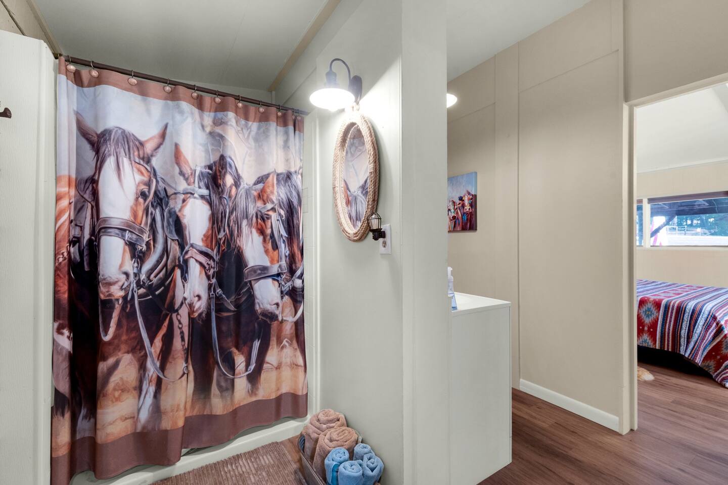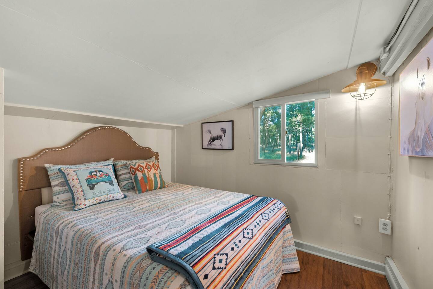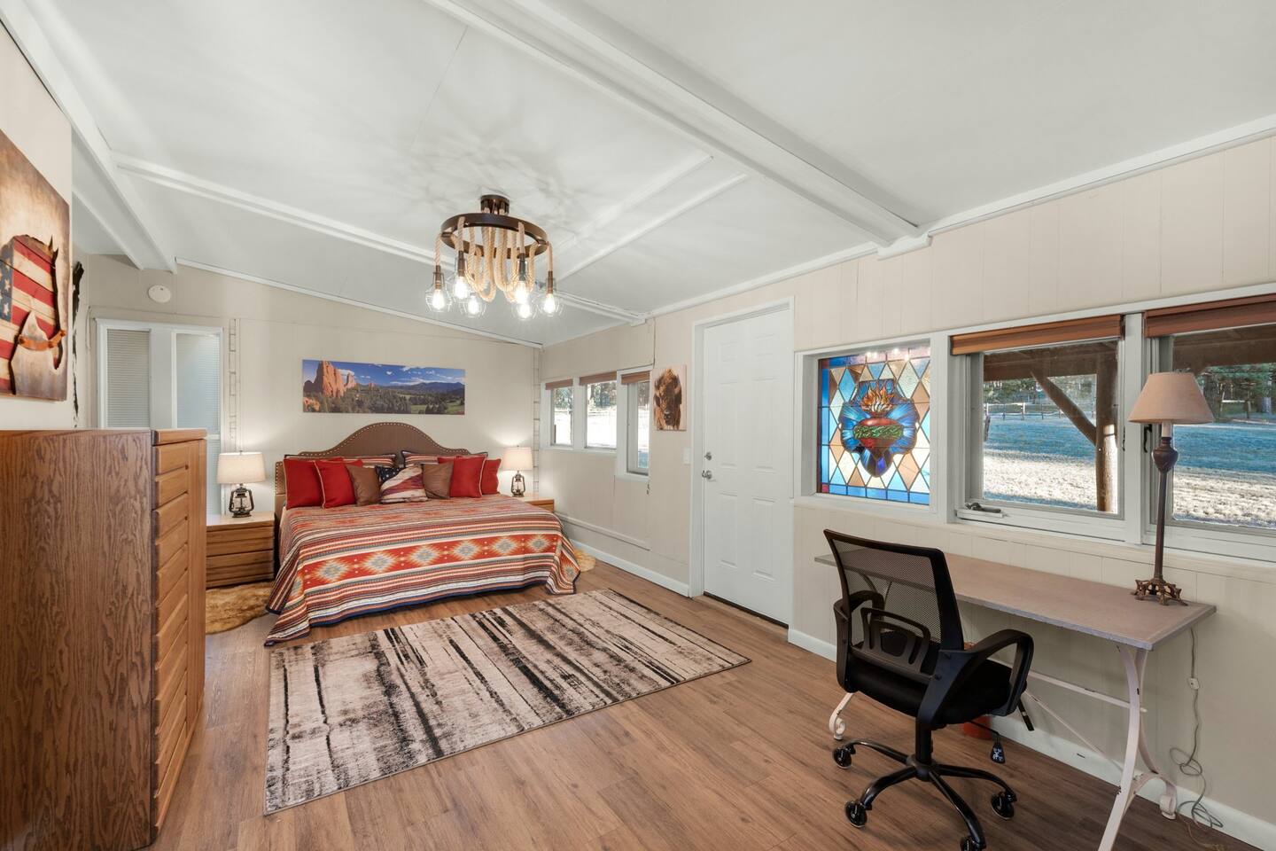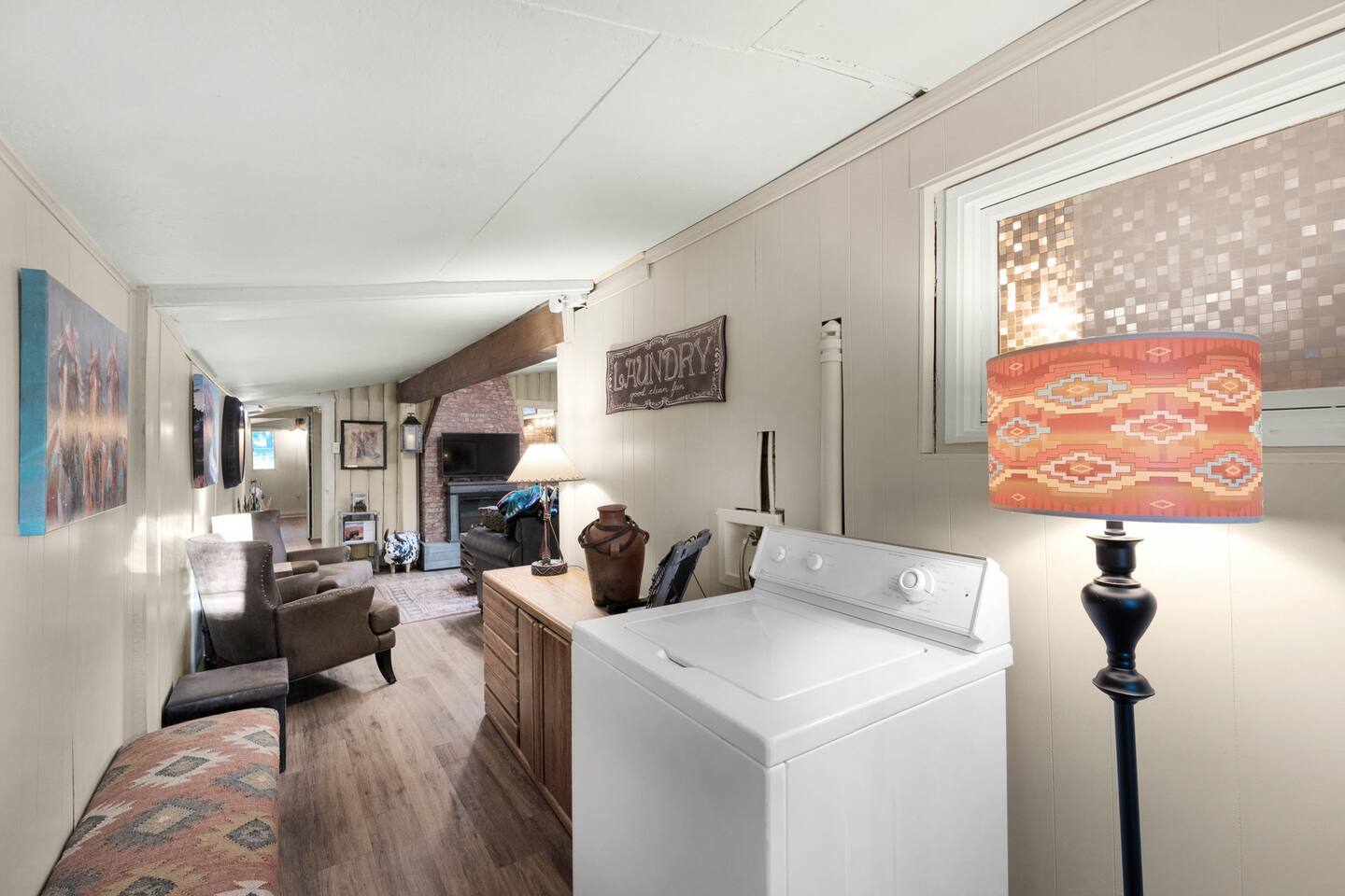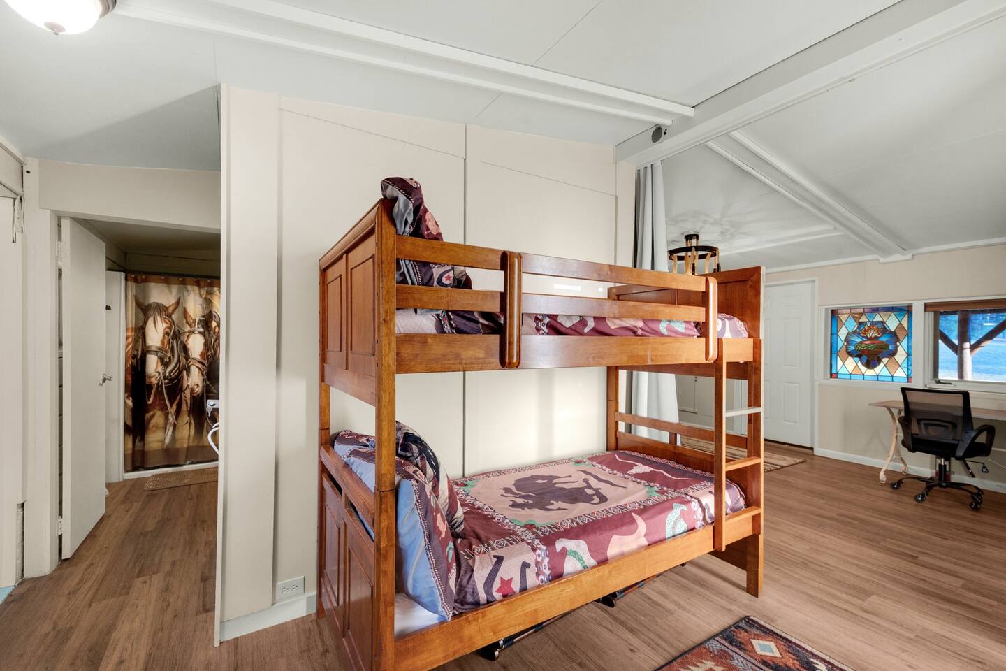 Step inside and you’ll find a space thoughtfully designed to reflect a western lifestyle, with cowhide chairs, saddle stools, and charming western touches throughout. The living room has an electric fireplace for cozy evenings, and the dining area — surrounded by windows — looks out over the pasture, making every meal or card game something special. The adjacent saloon room brings the Old West to life with its authentic décor, bar, and a second electric fireplace — perfect for telling stories, laughing late into the night, or simply soaking in the unique setting.