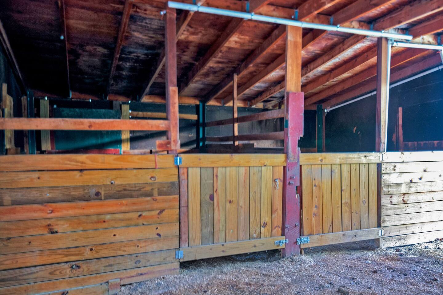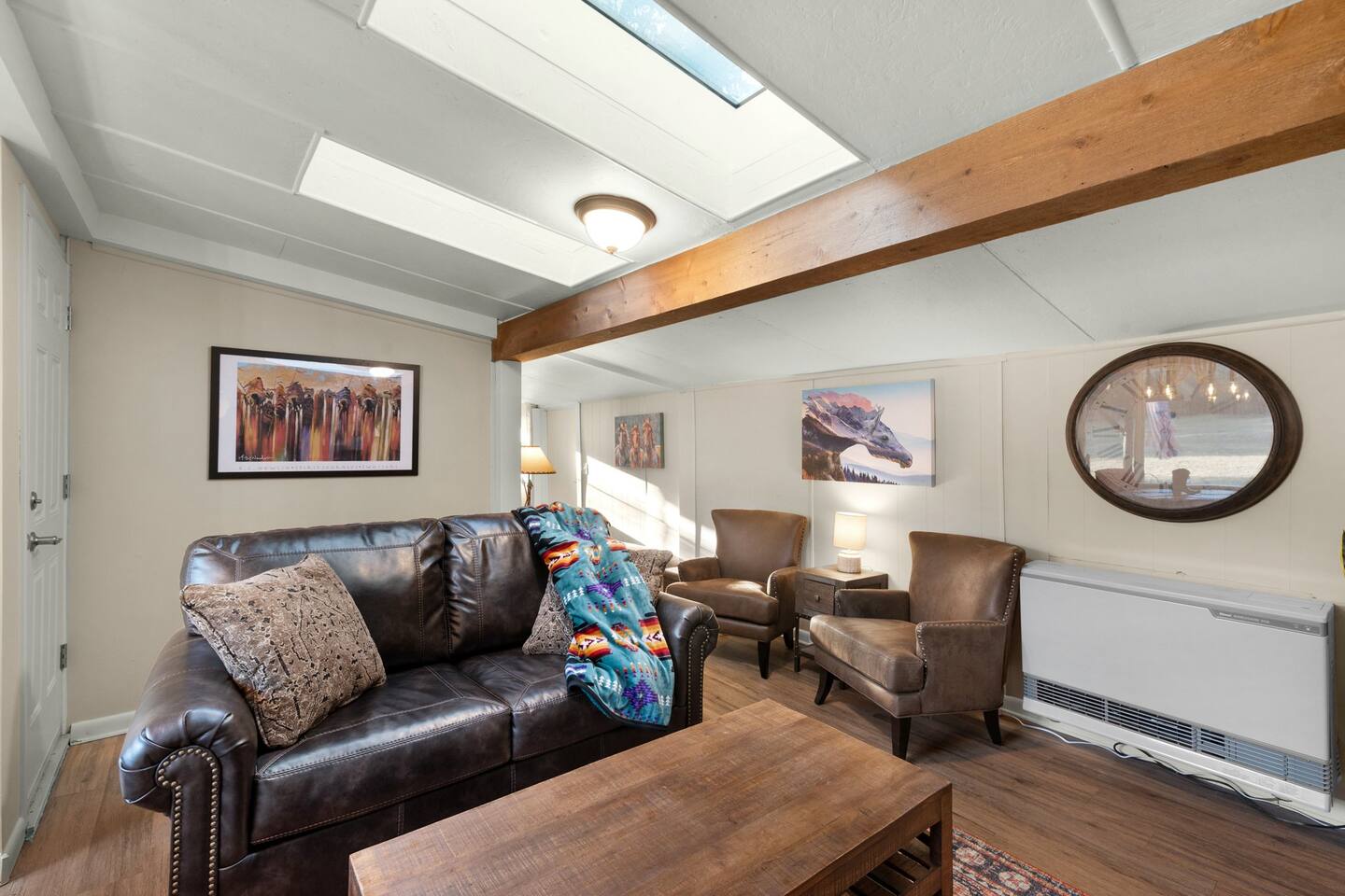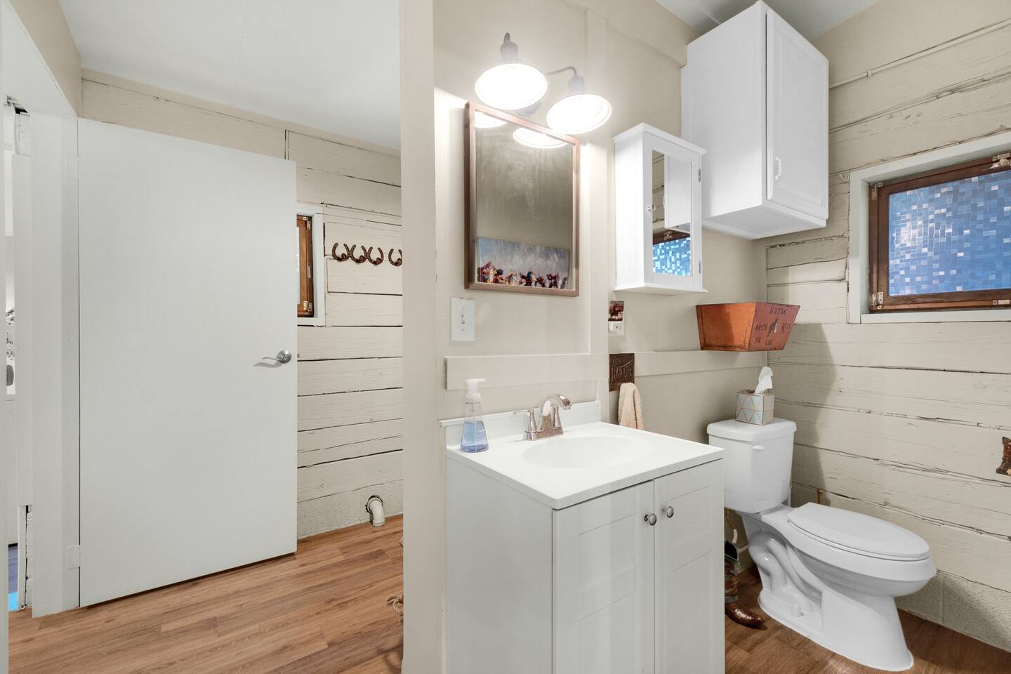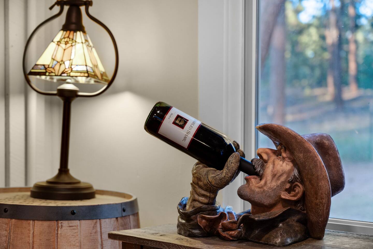 Step inside and you’ll find a space thoughtfully designed to reflect a western lifestyle, with cowhide chairs, saddle stools, and charming western touches throughout. The living room has an electric fireplace for cozy evenings, and the dining area — surrounded by windows — looks out over the pasture, making every meal or card game something special. The adjacent saloon room brings the Old West to life with its authentic décor, bar, and a second electric fireplace — perfect for telling stories, laughing late into the night, or simply soaking in the unique setting.