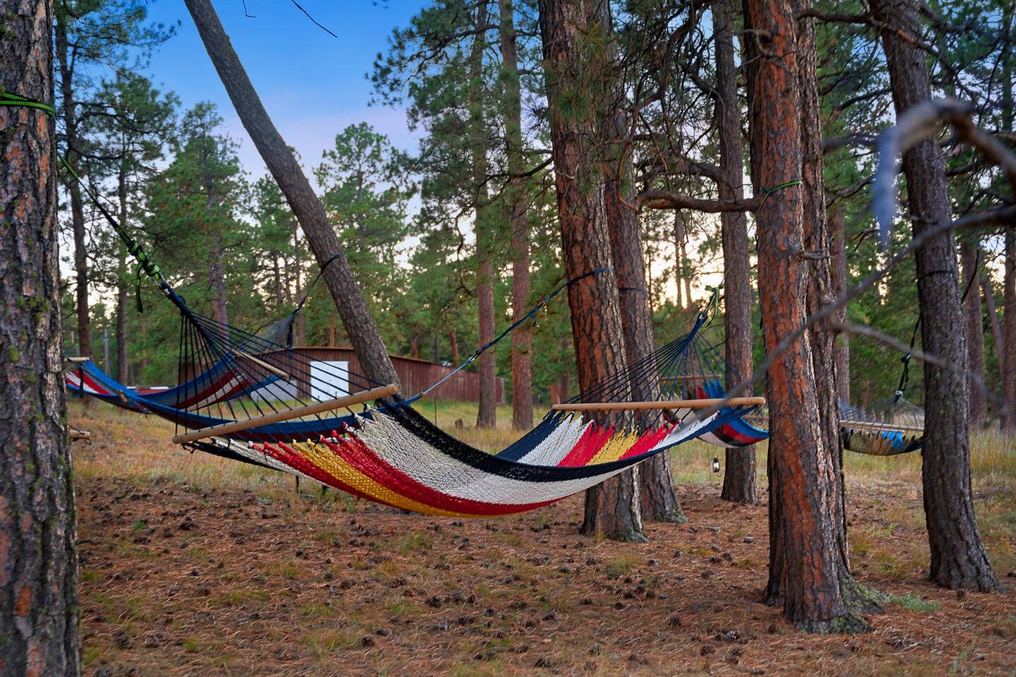 Outdoors, explore all 14 private acres — pasture and trees — head to the hammock garden via the lighted path and relax under the canopy of trees. The hammock garden is designed for total relaxation and immersion in nature. The fenced backyard is perfect for your furry friend to roam safely, and the cabin is dog-friendly. You'll also find a second cozy lounge area in the fenced yard — a great spot to enjoy a drink, read a book, or simply soak in the mountain air while your pup plays nearby. The front porch, with its four classic rocking chairs, is the ideal place to take in the tranquil views, enjoy a drink, and slow down.