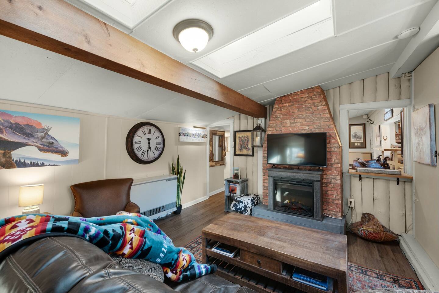 The master bedroom features a king-size bed and its own fireplace, with an attached bunk room separated by a barn door curtain. A second bedroom offers a queen bed, and the home includes two full bathrooms for convenience and comfort. There are three TVs — one in each bedroom and one in the living room — along with high-speed internet for those who want to stay connected.