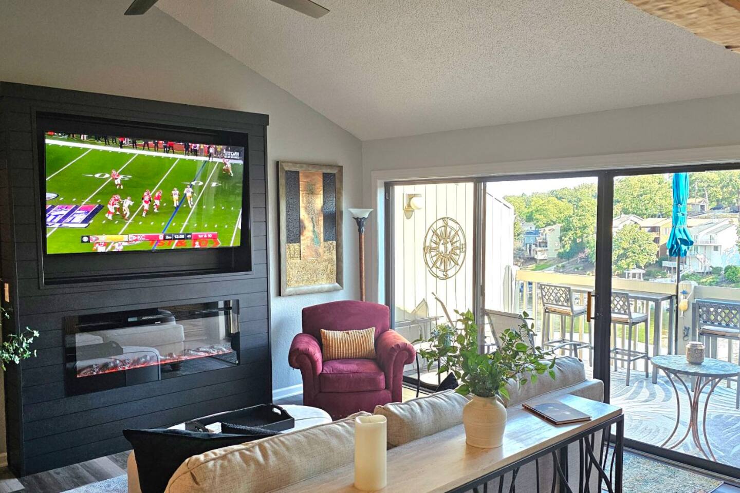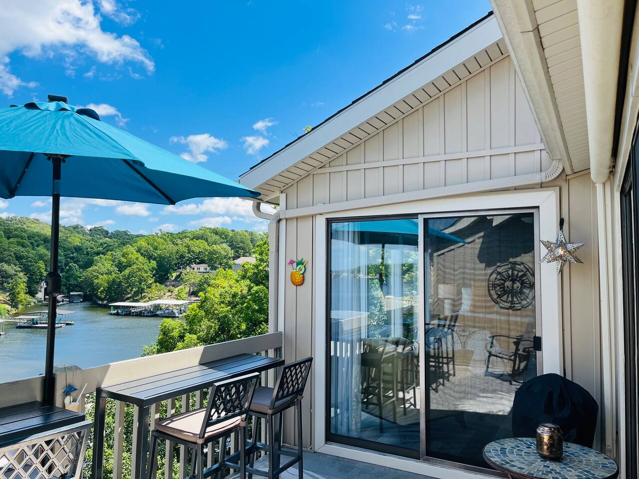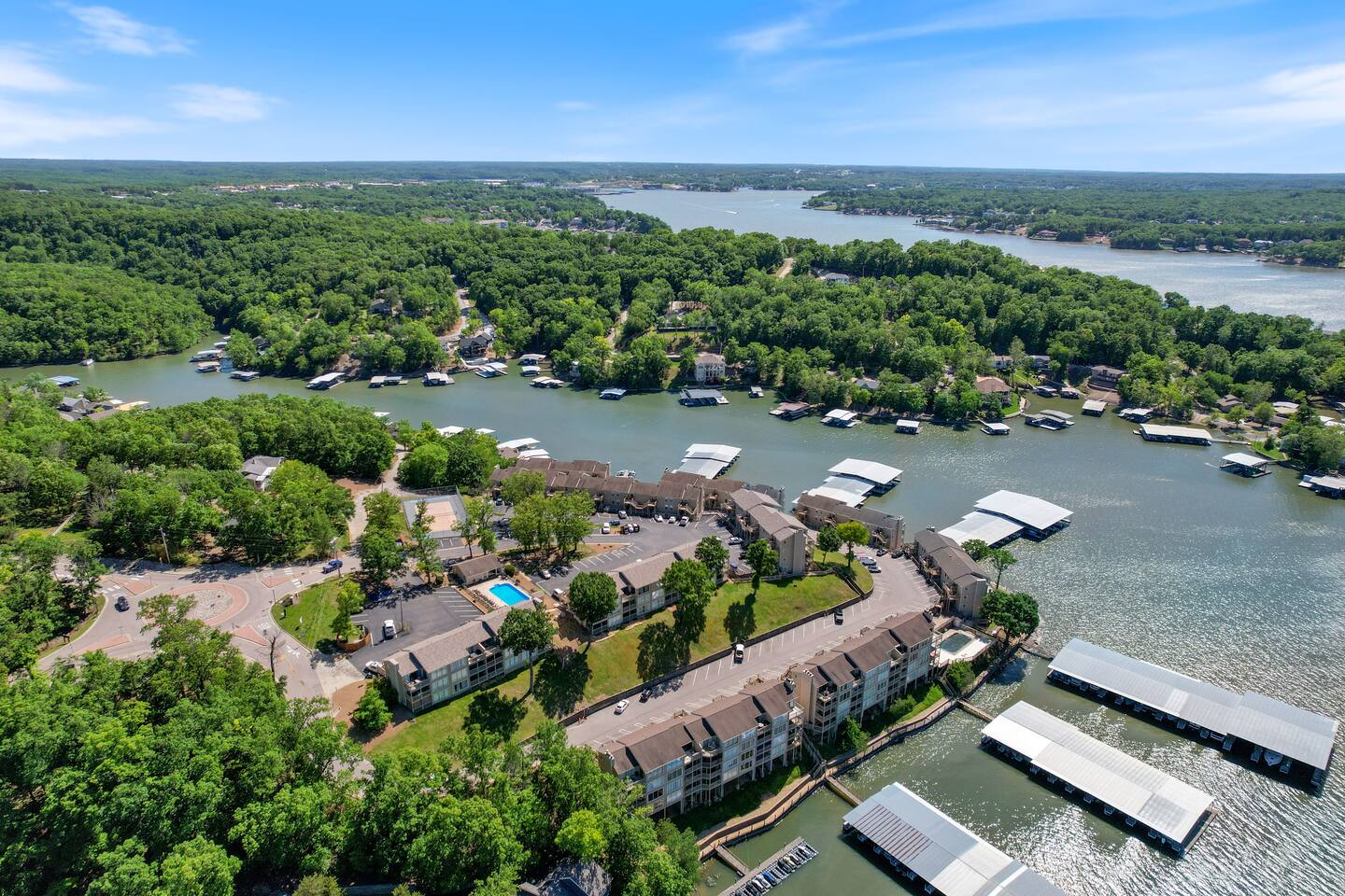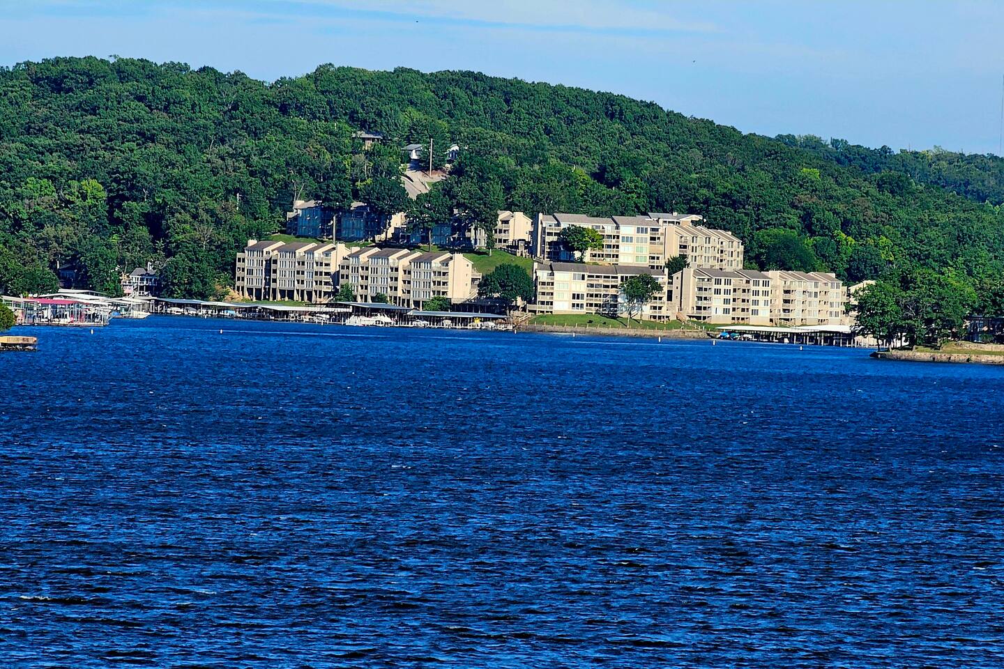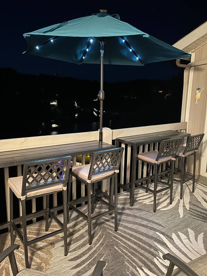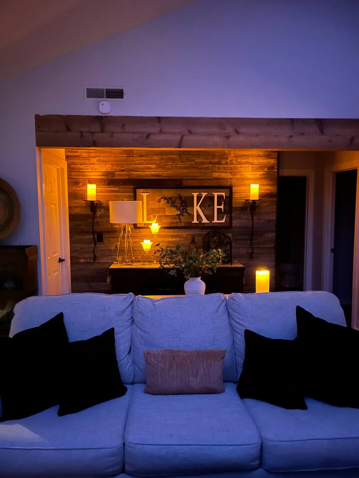 Welcome to Lakefront Stargazer, considered 5% of the very best of all eligible listings according to Airbnb's scoring. Our newly remodeled lakefront retreat designed for relaxation, adventure, and unforgettable stargazing nights. Nestled along the tranquil waters near the 17-mile marker, this top-floor condo offers breathtaking views, stylish comfort, and premium amenities. From the moment you arrive, convenience and comfort await. A dedicated front-row parking space makes arrival a breeze, and with just two easy flights of steps, you’ll be at the front door. Inside, vaulted ceilings and elegant décor create a warm, inviting ambiance. The living room features plush furnishings, a cozy fireplace, and a 65” HD Smart TV for movie nights. A dedicated wine and beverage station, complete with wine glasses and champagne flutes, invites you to unwind while taking in panoramic lake views through expansive windows. The fully stocked kitchen is a chef’s dream, equipped with brand-new appliances, a blender, crockpot, baking dishes, and more. Start your morning with a freshly brewed cup of coffee from the dual Keurig coffee maker, which offers both single-cup and carafe brewing options. The master suite boasts a luxurious king-size bed, a 50” TV, blackout shades, and bedside lamps with USB ports for added convenience. The attached spa-like bathroom features a walk-in rain shower for a rejuvenating experience. The guest bedroom offers a cozy queen-size bed, while a second full bathroom is pristine and well-stocked. For additional sleeping space, a queen-size pull-out sofa is available in the living room. Step outside onto the private fourth-level balcony, the perfect place to relax, sip a glass of wine, and take in the unobstructed night sky. Fire up the electric outdoor grill for an easy lakeside barbecue while enjoying the peaceful surroundings. The resort offers a variety of activities and amenities to make your stay even more enjoyable. Take a dip in one of the three pools, two of which are heated. Stay active with access to pickleball, tennis, shuffleboard, and basketball courts. A scenic quarter-mile boardwalk along the water’s edge is perfect for a peaceful stroll or fishing. For those who need to stay connected, the condo is equipped with high-speed internet and cable TV. A dedicated desk space is available, whether you need to catch up on work or give the kids a place to color and play. Centrally located, the condo is just minutes from local attractions, shopping, dining, and boat rentals, making it easy to explore everything the area has to offer. Great news! Pool season at Indian Pointe is just around the corner! The clubhouse pool (Pool #1) opens on May 1st, and Pools#2 and #3 will be ready for summer fun starting May 15th. All pools are open daily from 8 AM to 9 PM, giving you plenty of time to soak up the sun, take a refreshing dip, and enjoy the beautiful lake views. Get ready to relax and make the most of the season! Whether you're looking for a romantic lakeside retreat or an adventure-filled getaway, Lakefront Stargazer offers the perfect blend of comfort, convenience, and natural beauty. Book your stay today and experience the magic of lakefront living! PLEASE NOTE: No pets allowed and no smoking of any kind are not permitted. A minimum fee of $250 will be applied for violations of these rules.