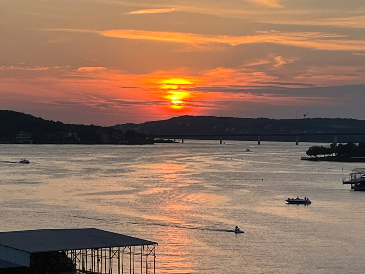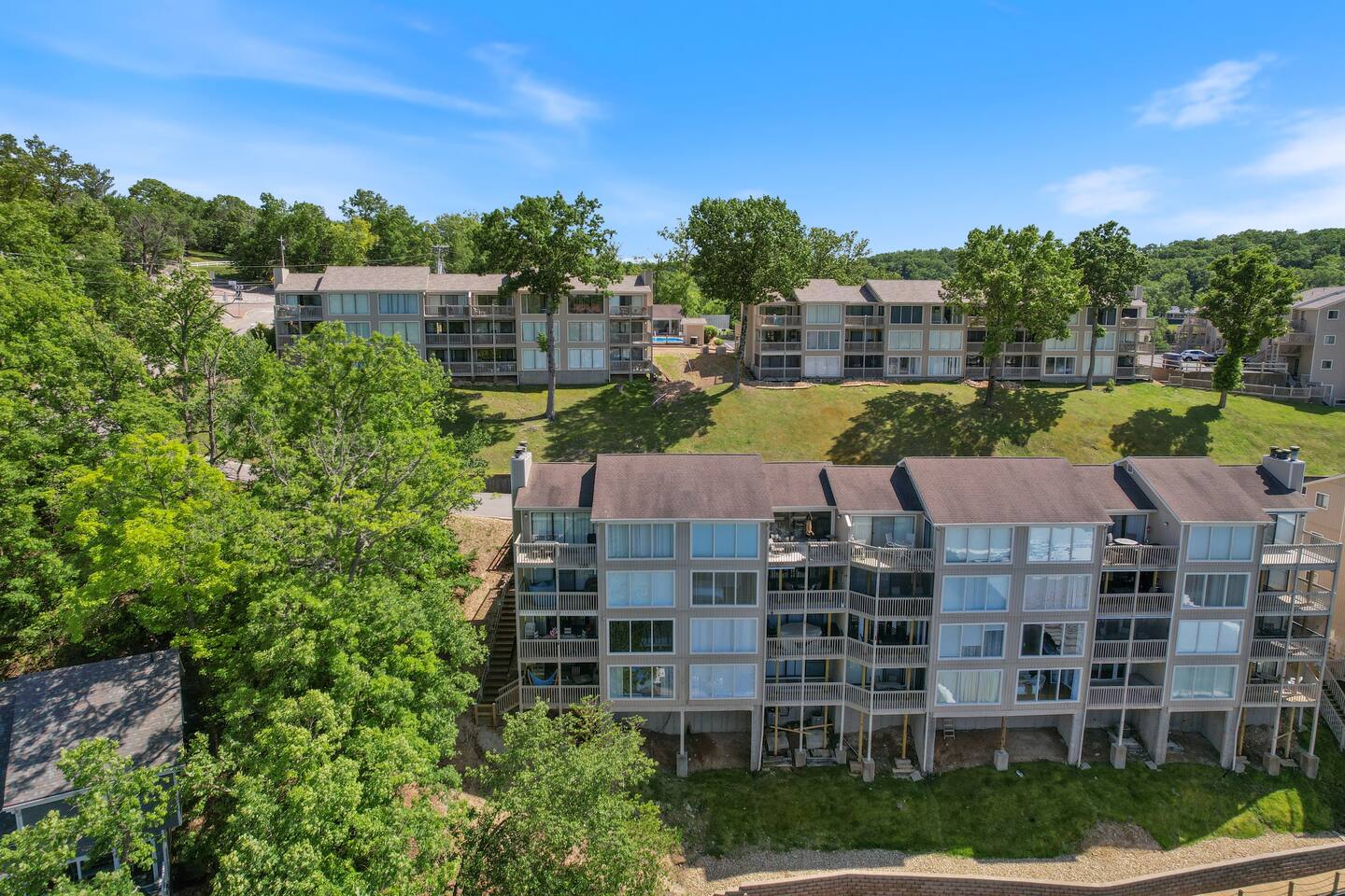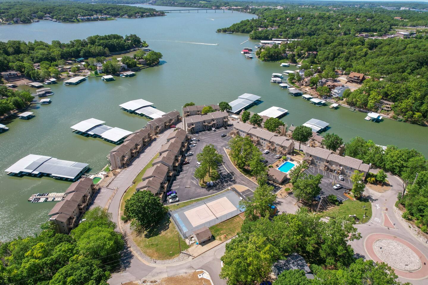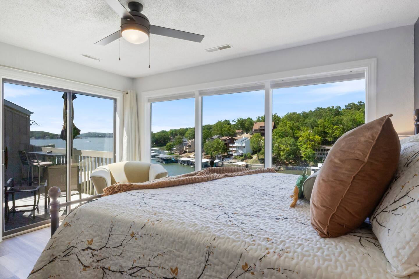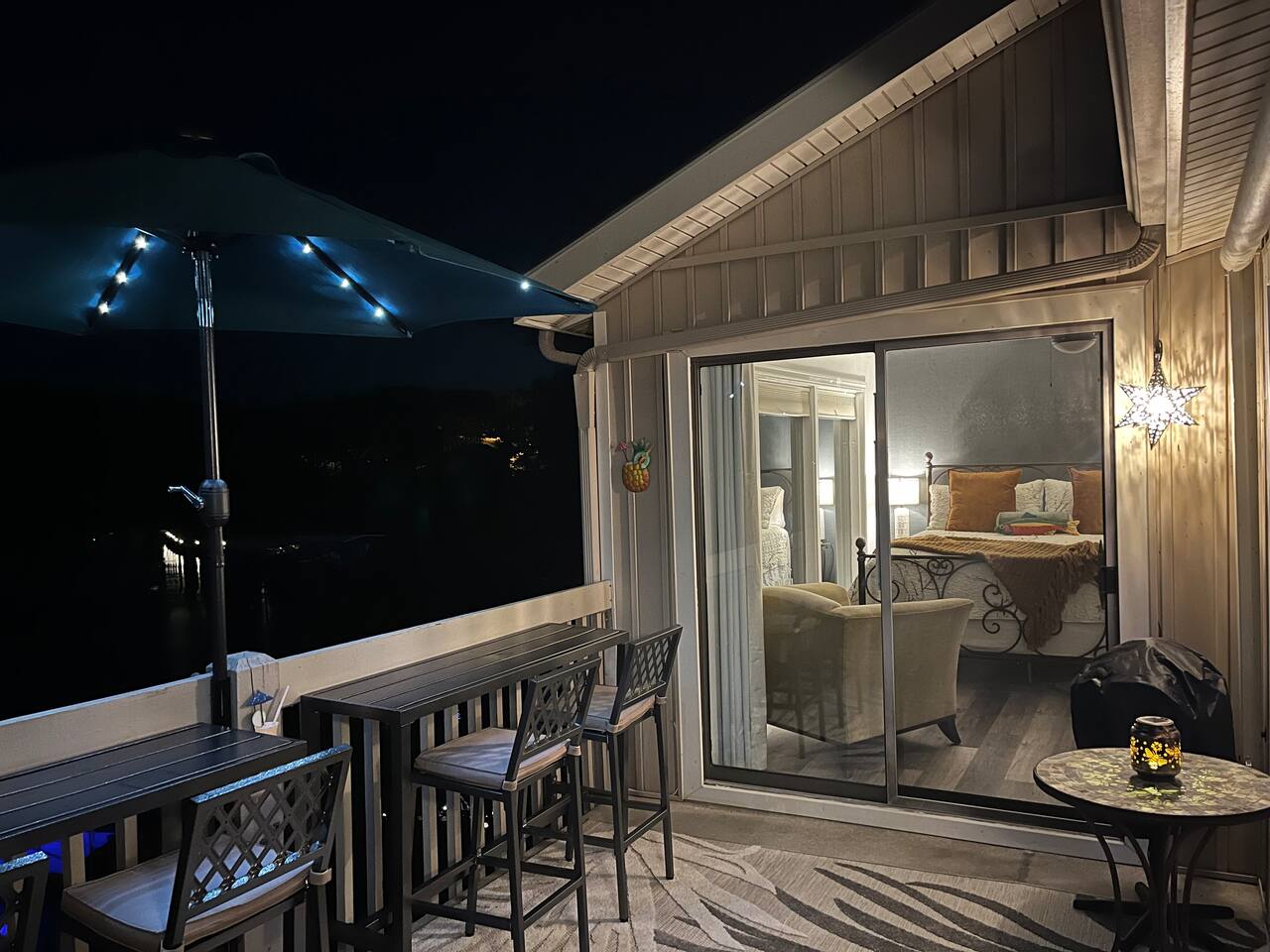 Welcome to Lakefront Stargazer, considered 5% of the very best of all eligible listings according to Airbnb's scoring. Our newly remodeled lakefront retreat designed for relaxation, adventure, and unforgettable stargazing nights. Nestled along the tranquil waters near the 17-mile marker, this top-floor condo offers breathtaking views, stylish comfort, and premium amenities. From the moment you arrive, convenience and comfort await. A dedicated front-row parking space makes arrival a breeze, and with just two easy flights of steps, you’ll be at the front door. Inside, vaulted ceilings and elegant décor create a warm, inviting ambiance. The living room features plush furnishings, a cozy fireplace, and a 65” HD Smart TV for movie nights. A dedicated wine and beverage station, complete with wine glasses and champagne flutes, invites you to unwind while taking in panoramic lake views through expansive windows. The fully stocked kitchen is a chef’s dream, equipped with brand-new appliances, a blender, crockpot, baking dishes, and more. Start your morning with a freshly brewed cup of coffee from the dual Keurig coffee maker, which offers both single-cup and carafe brewing options. The master suite boasts a luxurious king-size bed, a 50” TV, blackout shades, and bedside lamps with USB ports for added convenience. The attached spa-like bathroom features a walk-in rain shower for a rejuvenating experience. The guest bedroom offers a cozy queen-size bed, while a second full bathroom is pristine and well-stocked. For additional sleeping space, a queen-size pull-out sofa is available in the living room. Step outside onto the private fourth-level balcony, the perfect place to relax, sip a glass of wine, and take in the unobstructed night sky. Fire up the electric outdoor grill for an easy lakeside barbecue while enjoying the peaceful surroundings. The resort offers a variety of activities and amenities to make your stay even more enjoyable. Take a dip in one of the three pools, two of which are heated. Stay active with access to pickleball, tennis, shuffleboard, and basketball courts. A scenic quarter-mile boardwalk along the water’s edge is perfect for a peaceful stroll or fishing. For those who need to stay connected, the condo is equipped with high-speed internet and cable TV. A dedicated desk space is available, whether you need to catch up on work or give the kids a place to color and play. Centrally located, the condo is just minutes from local attractions, shopping, dining, and boat rentals, making it easy to explore everything the area has to offer. Great news! Pool season at Indian Pointe is just around the corner! The clubhouse pool (Pool #1) opens on May 1st, and Pools#2 and #3 will be ready for summer fun starting May 15th. All pools are open daily from 8 AM to 9 PM, giving you plenty of time to soak up the sun, take a refreshing dip, and enjoy the beautiful lake views. Get ready to relax and make the most of the season! Whether you're looking for a romantic lakeside retreat or an adventure-filled getaway, Lakefront Stargazer offers the perfect blend of comfort, convenience, and natural beauty. Book your stay today and experience the magic of lakefront living! PLEASE NOTE: No pets allowed and no smoking of any kind are not permitted. A minimum fee of $250 will be applied for violations of these rules.