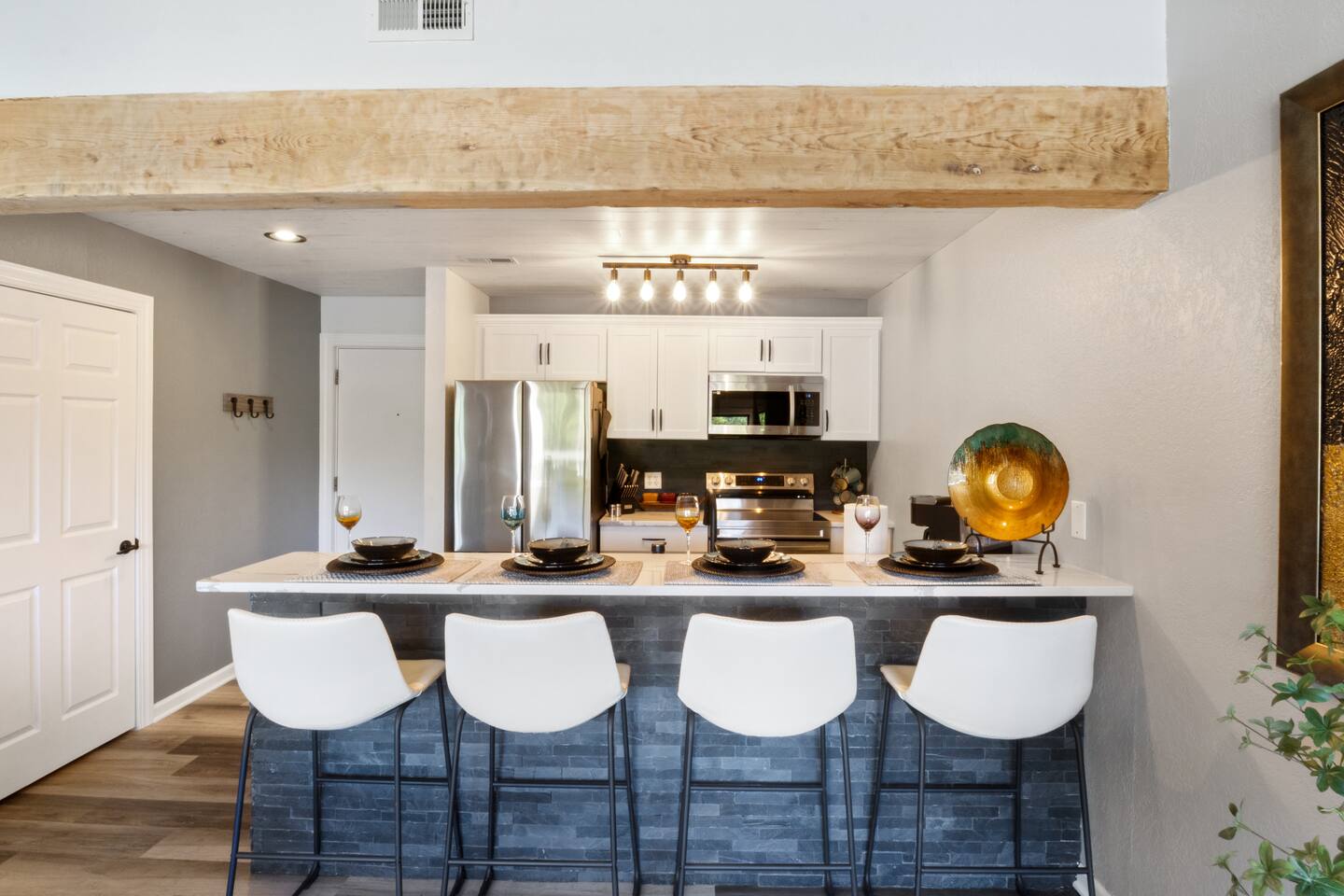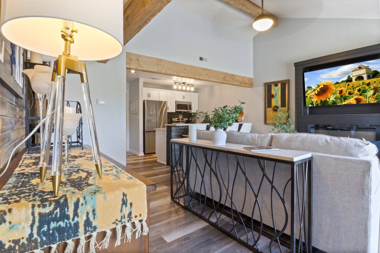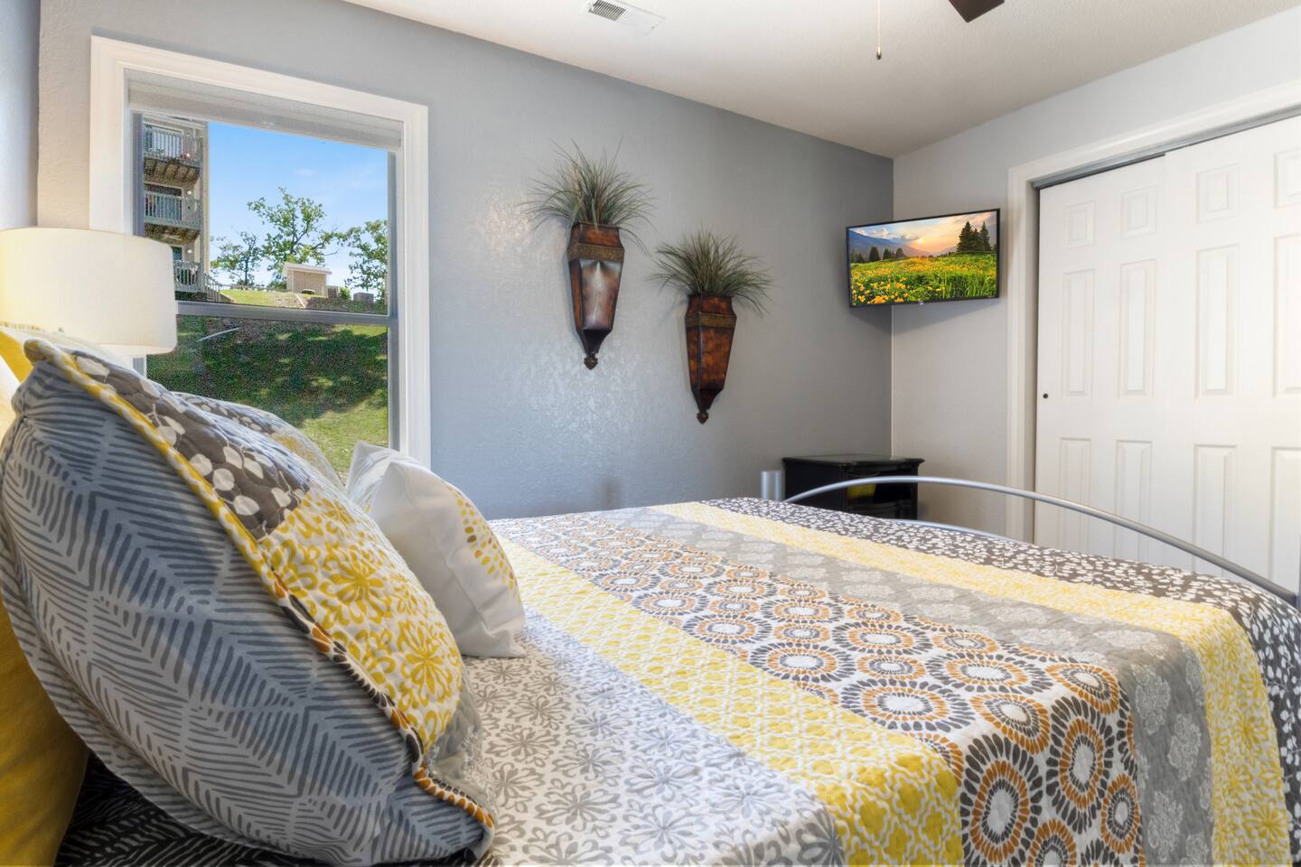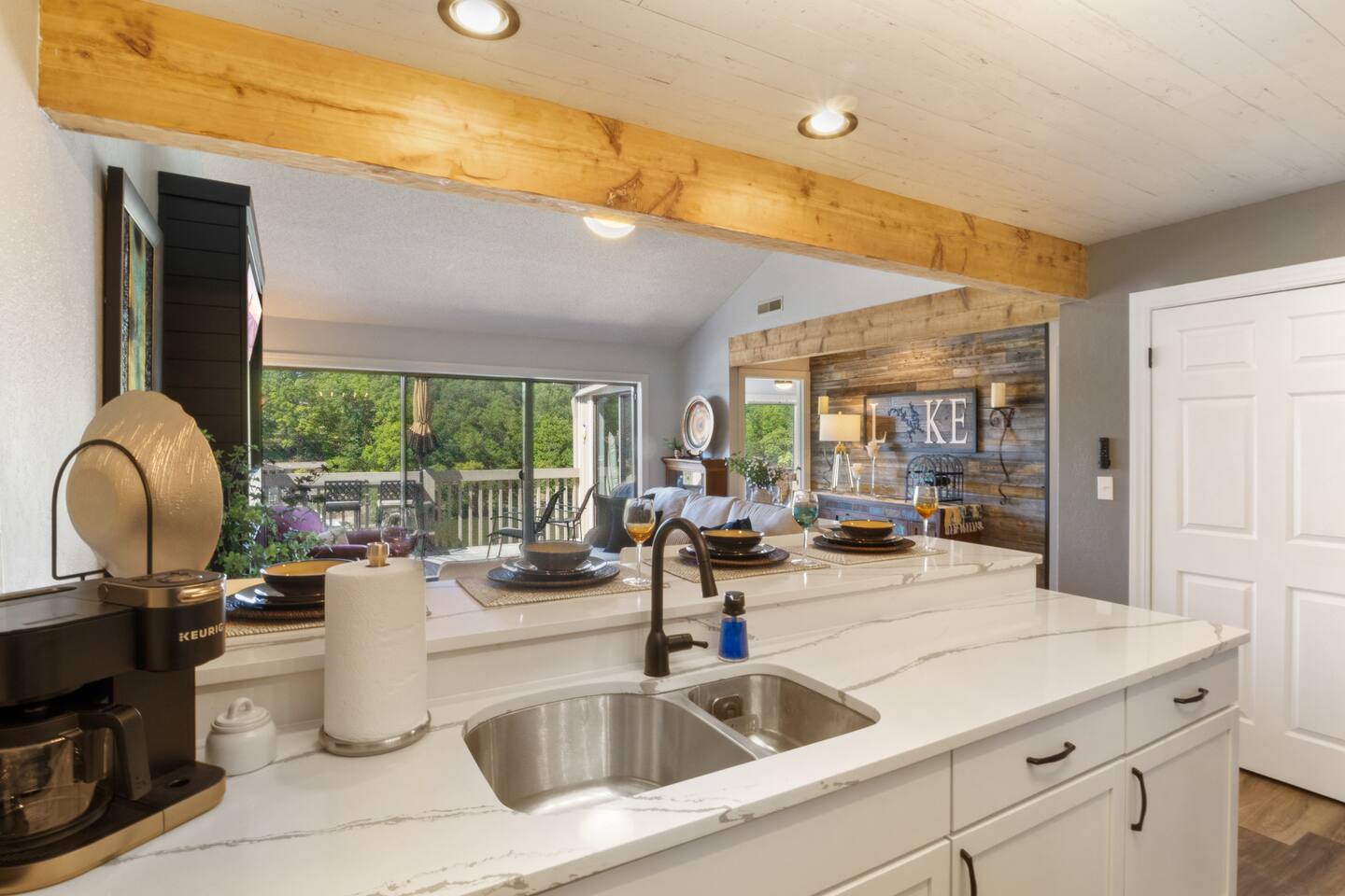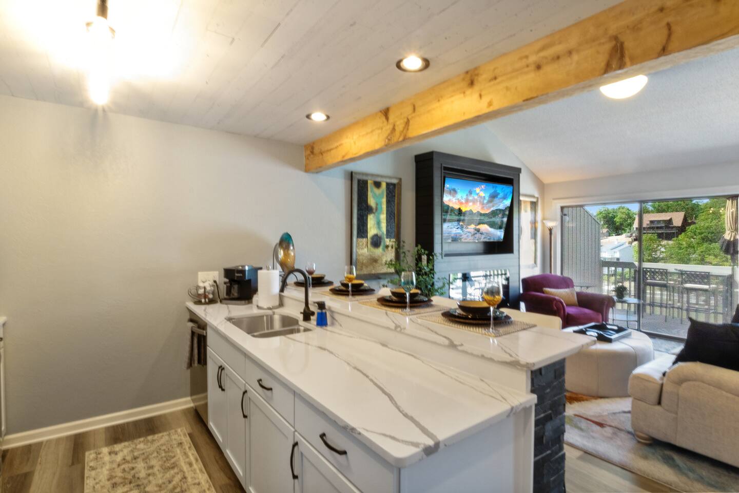 Welcome to Lakefront Stargazer, considered 5% of the very best of all eligible listings according to Airbnb's scoring. Our newly remodeled lakefront retreat designed for relaxation, adventure, and unforgettable stargazing nights. Nestled along the tranquil waters near the 17-mile marker, this top-floor condo offers breathtaking views, stylish comfort, and premium amenities. From the moment you arrive, convenience and comfort await. A dedicated front-row parking space makes arrival a breeze, and with just two easy flights of steps, you’ll be at the front door. Inside, vaulted ceilings and elegant décor create a warm, inviting ambiance. The living room features plush furnishings, a cozy fireplace, and a 65” HD Smart TV for movie nights. A dedicated wine and beverage station, complete with wine glasses and champagne flutes, invites you to unwind while taking in panoramic lake views through expansive windows. The fully stocked kitchen is a chef’s dream, equipped with brand-new appliances, a blender, crockpot, baking dishes, and more. Start your morning with a freshly brewed cup of coffee from the dual Keurig coffee maker, which offers both single-cup and carafe brewing options. The master suite boasts a luxurious king-size bed, a 50” TV, blackout shades, and bedside lamps with USB ports for added convenience. The attached spa-like bathroom features a walk-in rain shower for a rejuvenating experience. The guest bedroom offers a cozy queen-size bed, while a second full bathroom is pristine and well-stocked. For additional sleeping space, a queen-size pull-out sofa is available in the living room. Step outside onto the private fourth-level balcony, the perfect place to relax, sip a glass of wine, and take in the unobstructed night sky. Fire up the electric outdoor grill for an easy lakeside barbecue while enjoying the peaceful surroundings. The resort offers a variety of activities and amenities to make your stay even more enjoyable. Take a dip in one of the three pools, two of which are heated. Stay active with access to pickleball, tennis, shuffleboard, and basketball courts. A scenic quarter-mile boardwalk along the water’s edge is perfect for a peaceful stroll or fishing. For those who need to stay connected, the condo is equipped with high-speed internet and cable TV. A dedicated desk space is available, whether you need to catch up on work or give the kids a place to color and play. Centrally located, the condo is just minutes from local attractions, shopping, dining, and boat rentals, making it easy to explore everything the area has to offer. Great news! Pool season at Indian Pointe is just around the corner! The clubhouse pool (Pool #1) opens on May 1st, and Pools#2 and #3 will be ready for summer fun starting May 15th. All pools are open daily from 8 AM to 9 PM, giving you plenty of time to soak up the sun, take a refreshing dip, and enjoy the beautiful lake views. Get ready to relax and make the most of the season! Whether you're looking for a romantic lakeside retreat or an adventure-filled getaway, Lakefront Stargazer offers the perfect blend of comfort, convenience, and natural beauty. Book your stay today and experience the magic of lakefront living! PLEASE NOTE: No pets allowed and no smoking of any kind are not permitted. A minimum fee of $250 will be applied for violations of these rules.