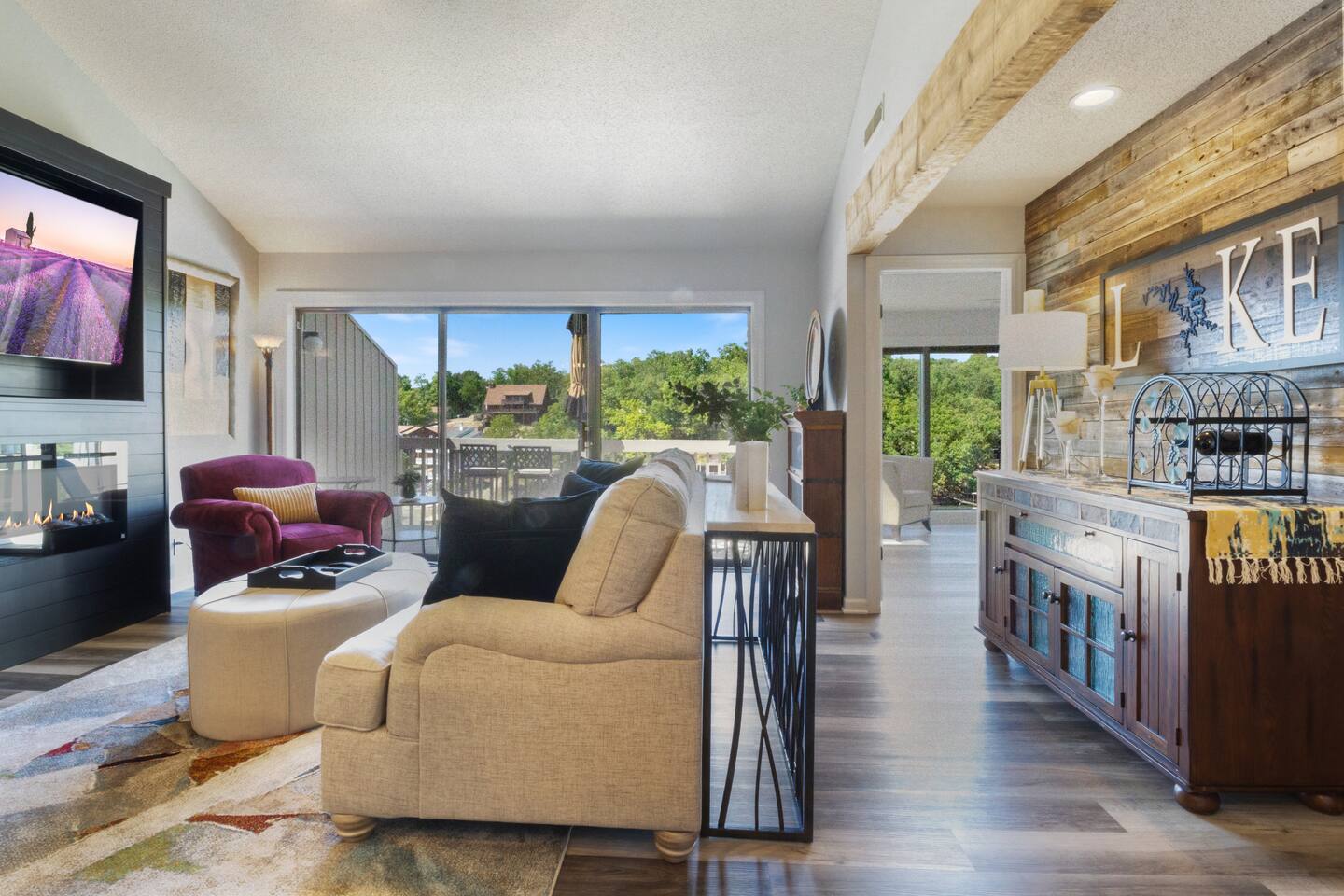 * Lakefront * Newly Remodelled * New Furnishings * Stylish Electric Fireplace * 65" Smart TV/High Definition * King & Queen Size Beds * Top Level/Vaulted Ceilings * High Speed Internet * Cable TV* Wine Bar/Drink Station* Work Space*Expansive Views* Fully Equipped Kitchen* Keurig Dual Coffee Maker*Walk-in Shower* Boardwalk* Pickleball* Tennis* 3 Pools* Basketball* Shuffleboard*