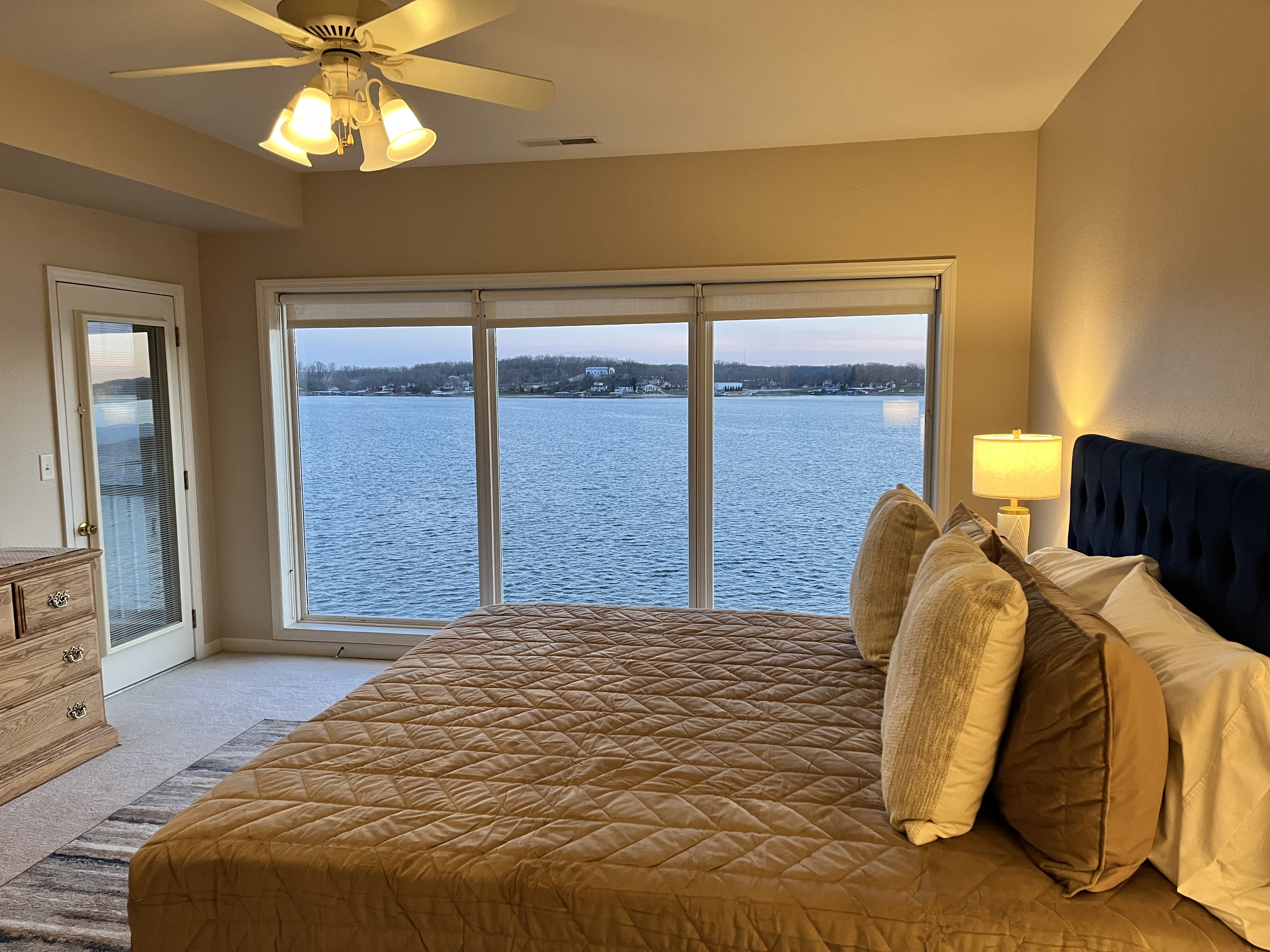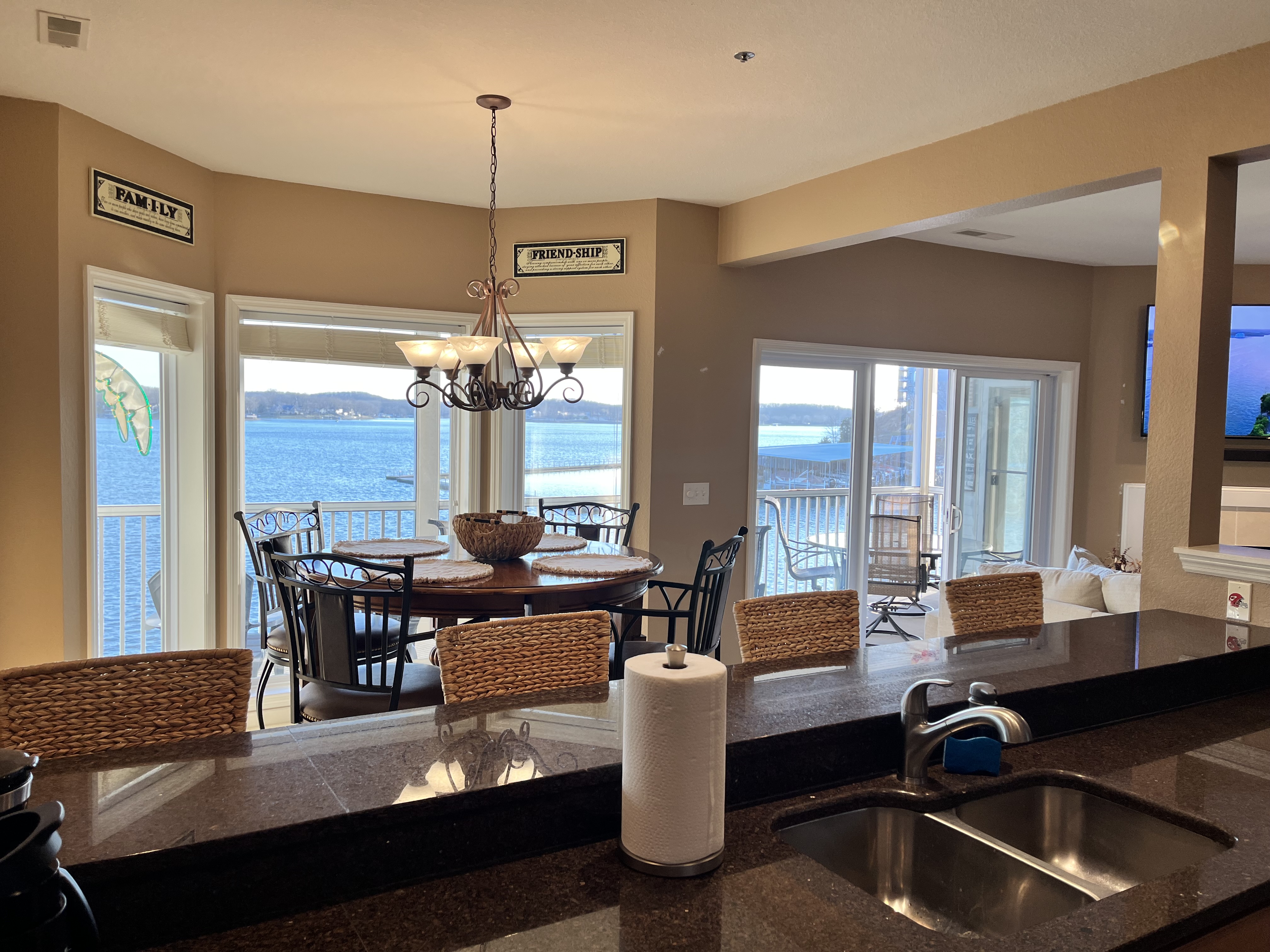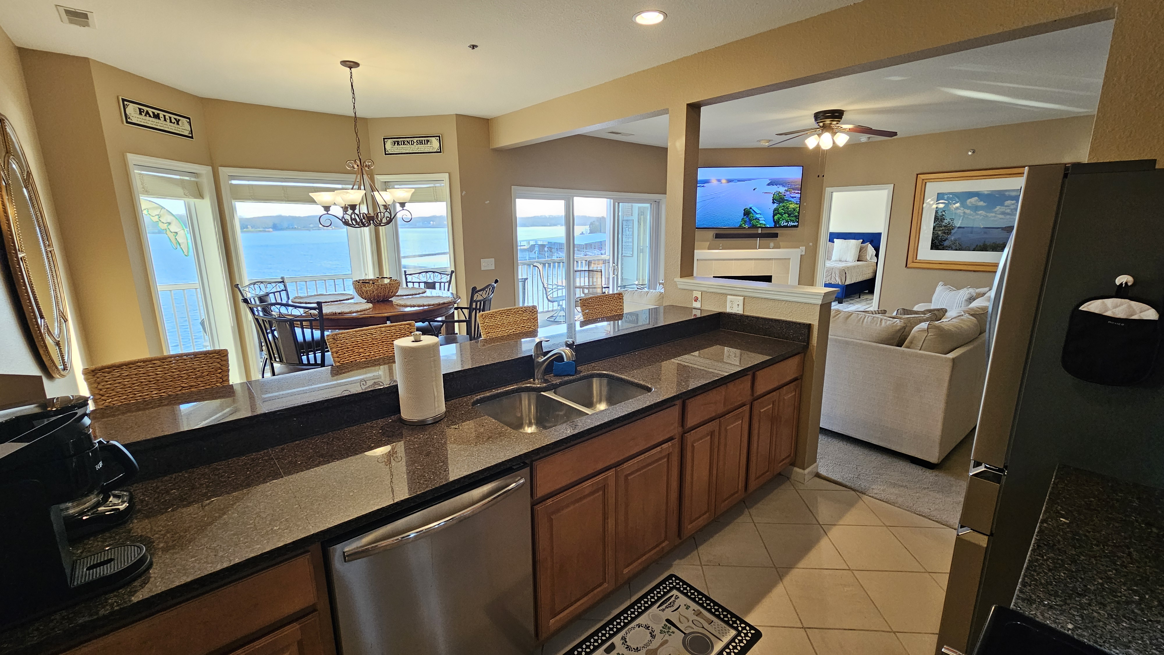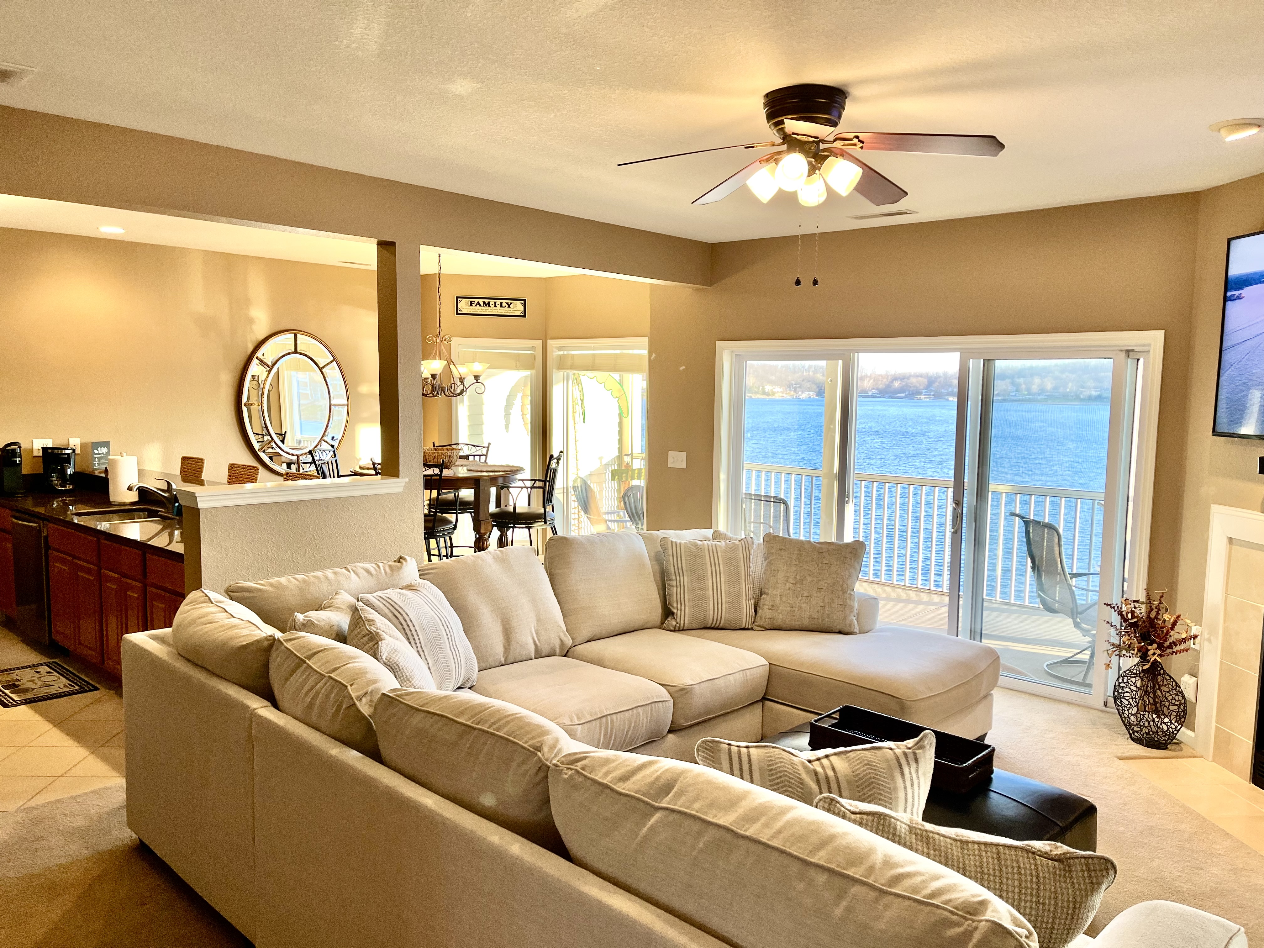 Welcome to Lookout Oasis, where the views truly take center stage. Perched in Regatta Bay, this spacious 3-bedroom, 3-bath condo offers breathtaking, up-close lake views that make you feel like you’re right on the water. From the moment you walk in, your eyes are drawn straight through the open living space to the lake beyond, setting the tone for a relaxing and memorable stay. The living room is open and inviting, designed for gathering and relaxing while taking in the view. A large sectional provides plenty of seating for your group, and the space flows seamlessly into the dining area, where there is seating for eight with four at the table and four at the bar. The kitchen is equally impressive, featuring granite countertops and a spacious layout that makes it easy to cook and entertain. It is fully stocked with all new dishware, pots and pans, and everything you need to prepare great meals, along with both drip and pod coffee options to start your mornings right. The primary suite is a standout, offering a bright and spacious retreat with incredible water views and its own private access to the patio, making it easy to step outside and enjoy the lake at any time of day. The king bed and 40-inch TV create a comfortable place to unwind, while the en suite bathroom features dual sinks and a tub/shower combination, giving you plenty of space to get ready. The second bedroom offers a queen bed, a 40-inch TV, and its own private en suite bathroom, providing both comfort and privacy for guests. The third bedroom is ideal for families or groups, with bunk-style double beds and an additional twin bed, along with a TV. The third bathroom is conveniently located and can function as a shared space or as a private en suite for this bedroom, offering flexibility depending on your group’s needs. Step outside onto the oversized private patio, where the name Lookout Oasis truly comes to life. The lake feels incredibly close, and the views are simply stunning. The patio features a large round table that seats six, along with additional seating for relaxing and taking in the scenery. A mounted outdoor TV allows you to enjoy your favorite shows or games while still soaking in the view, creating the perfect setting for both mornings and evenings at the lake. A brand-new grill is conveniently located at the front entrance of the condo for easy access. A full-size washer and dryer are available in the condo for your convenience, making longer stays or family trips even easier. The unit is easy to access with only two steps at the entrance, making loading and unloading simple and convenient. Located within Regatta Bay, guests also enjoy access to a wide range of resort-style amenities. The complex features two swimming pools, including a lakefront pool, along with beautifully maintained grounds that create a peaceful, park-like setting. There are tennis and pickleball courts, a basketball court, and a playground, offering something for everyone in your group. Covered picnic and grilling areas, a clubhouse, and lake access with docks and swim areas make it easy to enjoy everything the Lake of the Ozarks has to offer. The location is ideal, putting you just minutes from popular restaurants, shopping, golf, and lakefront attractions by both land and water. Lookout Oasis combines space, comfort, and unbeatable views with the added bonus of resort-style amenities, creating the perfect setting for your next lake getaway. PLEASE NOTE: No pets allowed and no smoking of any kind are permitted. A minimum fee of $250 will be applied for violation of these rules. Other things to note: We provide complimentary coffee (pod and ground), sugar and coffee creamer. We also provide basic seasonings, such as salt, pepper, garlic salt, seasoning salt, olive oil, ensuring you have everything you need to prepare delicious meals. And of course, we've got your personal care covered with shampoo, conditioner, body wash, a selection of bonus toiletries and laundry soap. Pack light and enjoy the convenience our thoughtfully stocked amenities!