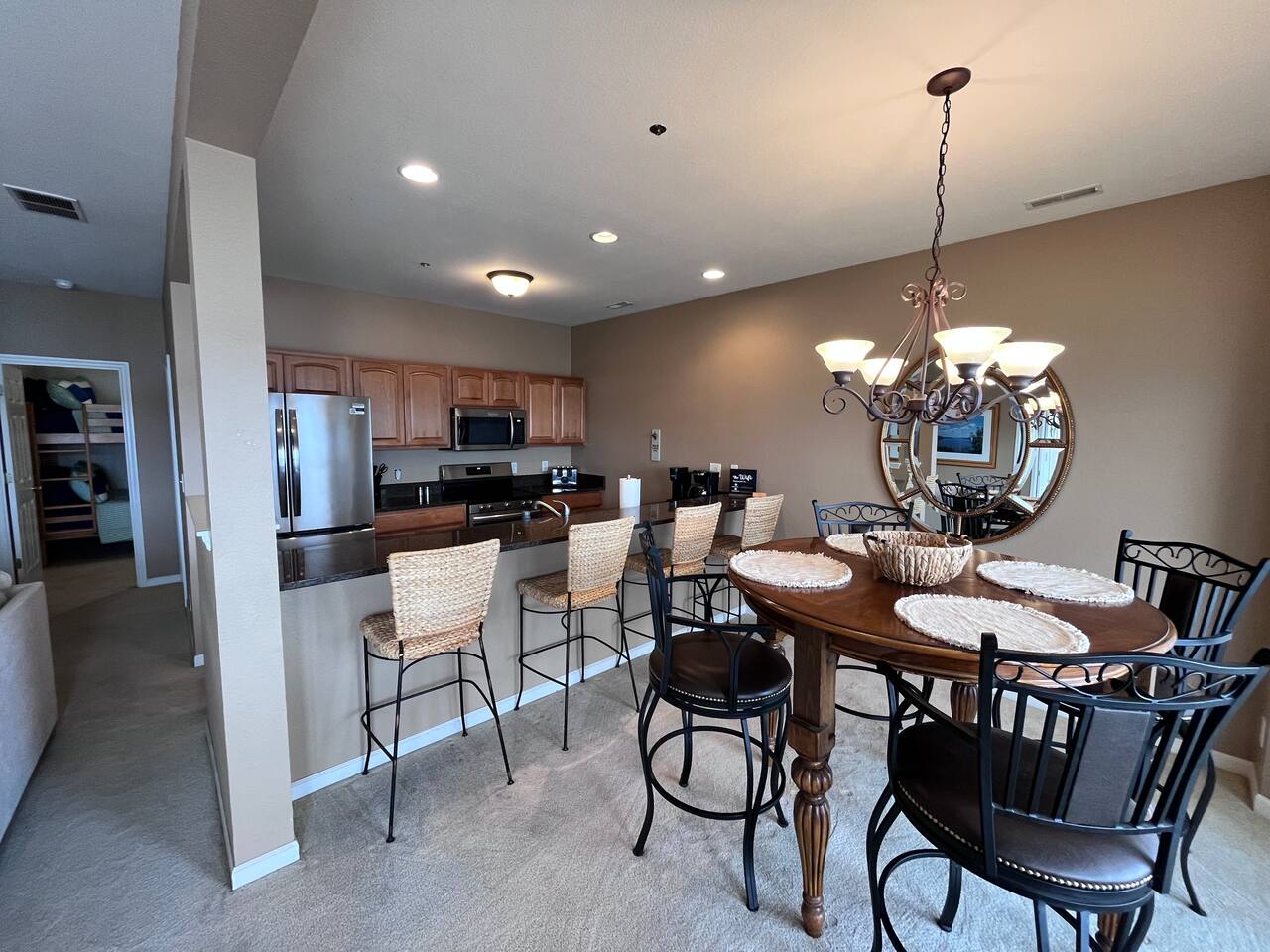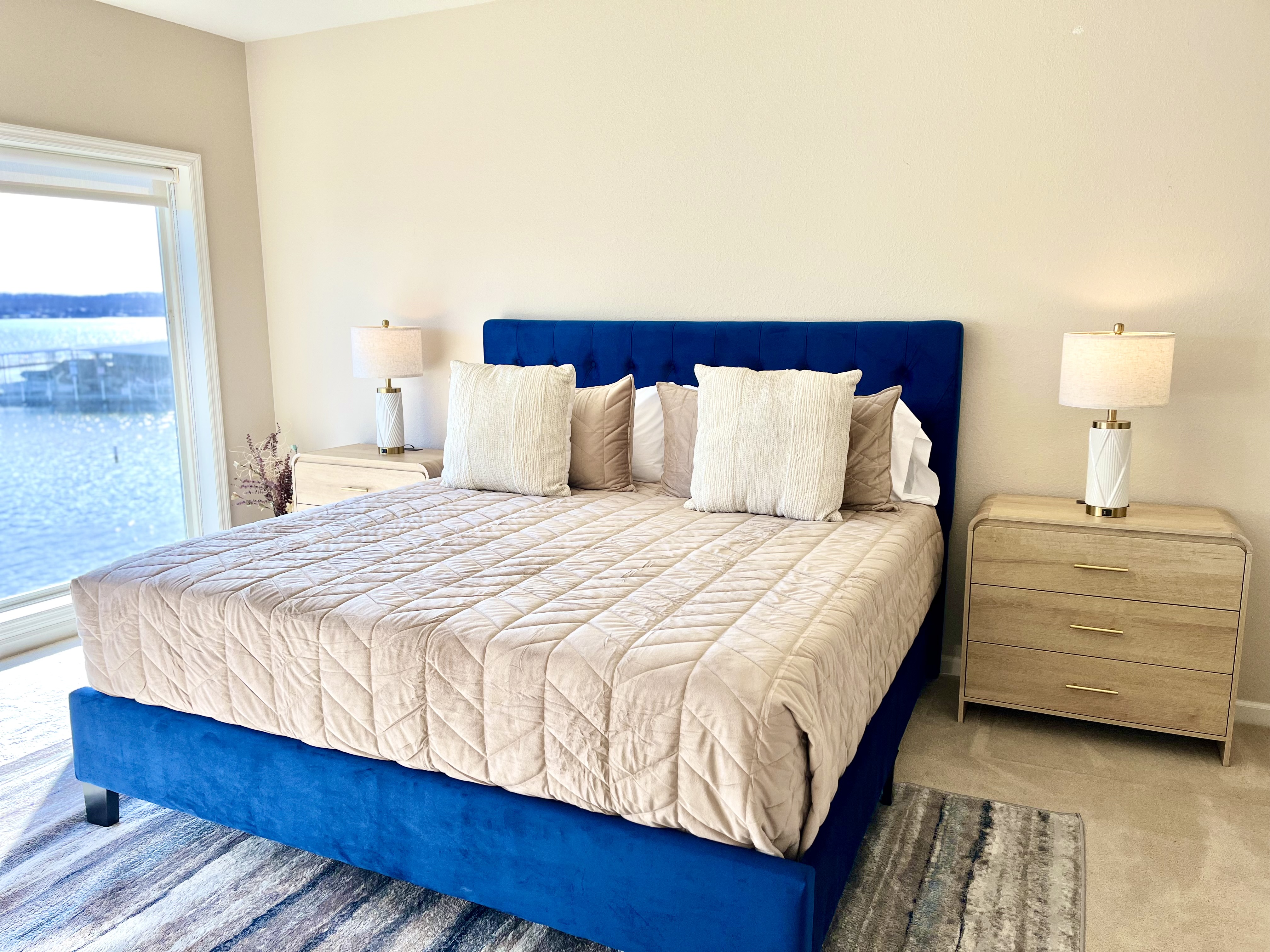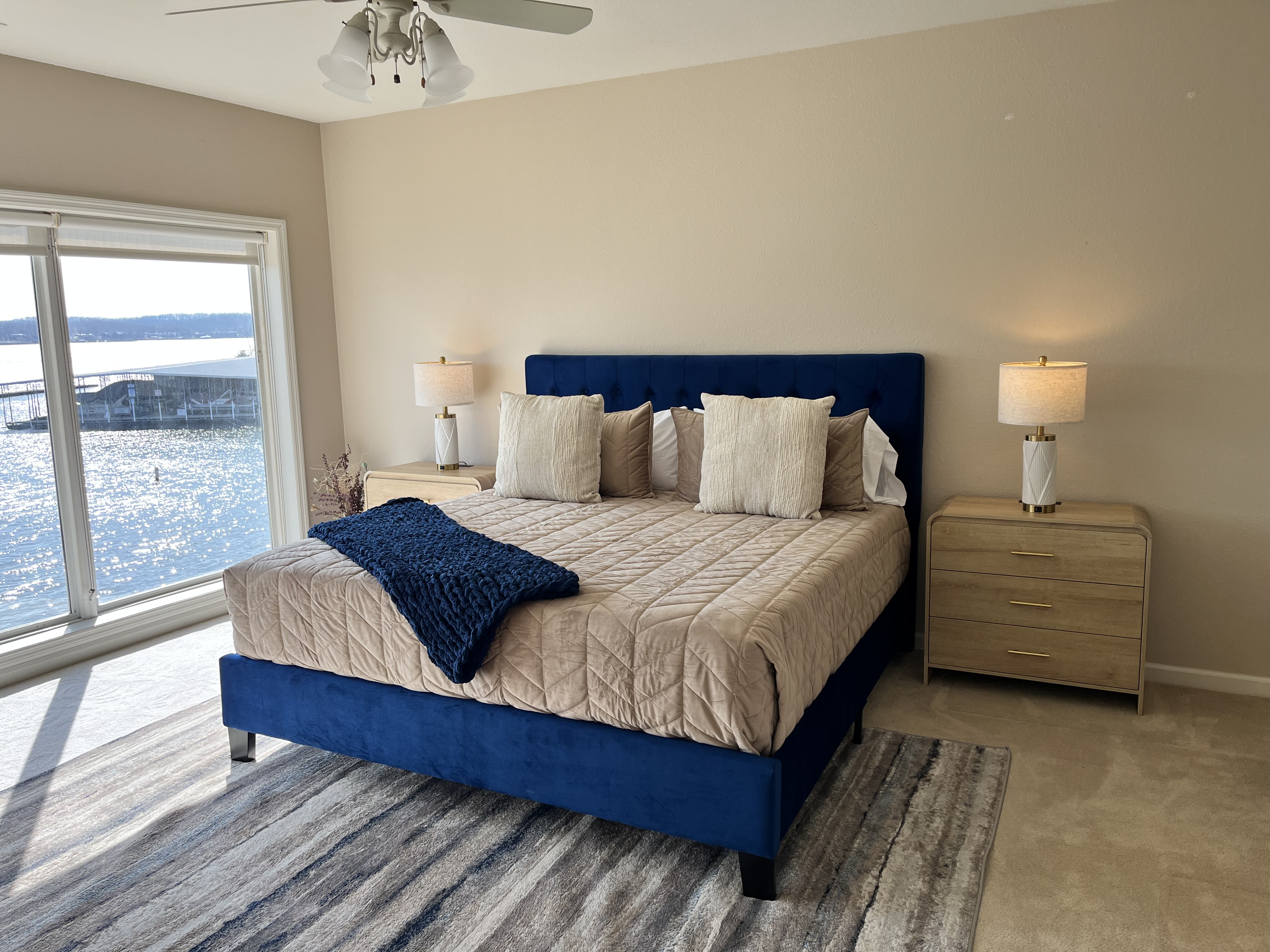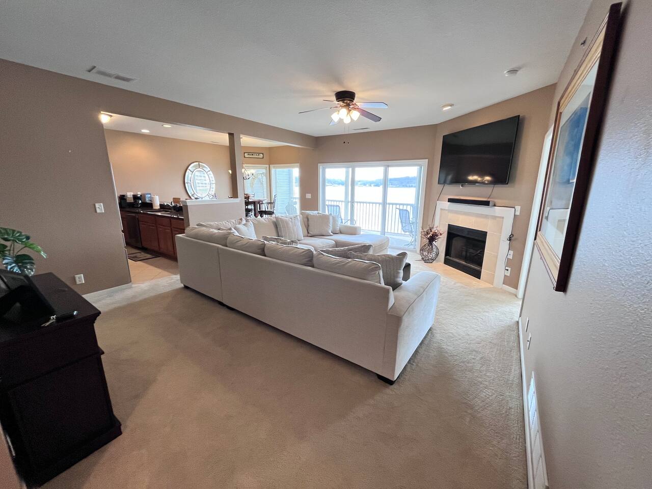 Welcome to Lookout Oasis, where the views truly take center stage. Perched in Regatta Bay, this spacious 3-bedroom, 3-bath condo offers breathtaking, up-close lake views that make you feel like you’re right on the water. From the moment you walk in, your eyes are drawn straight through the open living space to the lake beyond, setting the tone for a relaxing and memorable stay. The living room is open and inviting, designed for gathering and relaxing while taking in the view. A large sectional provides plenty of seating for your group, and the space flows seamlessly into the dining area, where there is seating for eight with four at the table and four at the bar. The kitchen is equally impressive, featuring granite countertops and a spacious layout that makes it easy to cook and entertain. It is fully stocked with all new dishware, pots and pans, and everything you need to prepare great meals, along with both drip and pod coffee options to start your mornings right. The primary suite is a standout, offering a bright and spacious retreat with incredible water views and its own private access to the patio, making it easy to step outside and enjoy the lake at any time of day. The king bed and 40-inch TV create a comfortable place to unwind, while the en suite bathroom features dual sinks and a tub/shower combination, giving you plenty of space to get ready. The second bedroom offers a queen bed, a 40-inch TV, and its own private en suite bathroom, providing both comfort and privacy for guests. The third bedroom is ideal for families or groups, with bunk-style double beds and an additional twin bed, along with a TV. The third bathroom is conveniently located and can function as a shared space or as a private en suite for this bedroom, offering flexibility depending on your group’s needs. Step outside onto the oversized private patio, where the name Lookout Oasis truly comes to life. The lake feels incredibly close, and the views are simply stunning. The patio features a large round table that seats six, along with additional seating for relaxing and taking in the scenery. A mounted outdoor TV allows you to enjoy your favorite shows or games while still soaking in the view, creating the perfect setting for both mornings and evenings at the lake. A brand-new grill is conveniently located at the front entrance of the condo for easy access. A full-size washer and dryer are available in the condo for your convenience, making longer stays or family trips even easier. The unit is easy to access with only two steps at the entrance, making loading and unloading simple and convenient. Located within Regatta Bay, guests also enjoy access to a wide range of resort-style amenities. The complex features two swimming pools, including a lakefront pool, along with beautifully maintained grounds that create a peaceful, park-like setting. There are tennis and pickleball courts, a basketball court, and a playground, offering something for everyone in your group. Covered picnic and grilling areas, a clubhouse, and lake access with docks and swim areas make it easy to enjoy everything the Lake of the Ozarks has to offer. The location is ideal, putting you just minutes from popular restaurants, shopping, golf, and lakefront attractions by both land and water. Lookout Oasis combines space, comfort, and unbeatable views with the added bonus of resort-style amenities, creating the perfect setting for your next lake getaway. PLEASE NOTE: No pets allowed and no smoking of any kind are permitted. A minimum fee of $250 will be applied for violation of these rules. Other things to note: We provide complimentary coffee (pod and ground), sugar and coffee creamer. We also provide basic seasonings, such as salt, pepper, garlic salt, seasoning salt, olive oil, ensuring you have everything you need to prepare delicious meals. And of course, we've got your personal care covered with shampoo, conditioner, body wash, a selection of bonus toiletries and laundry soap. Pack light and enjoy the convenience our thoughtfully stocked amenities!