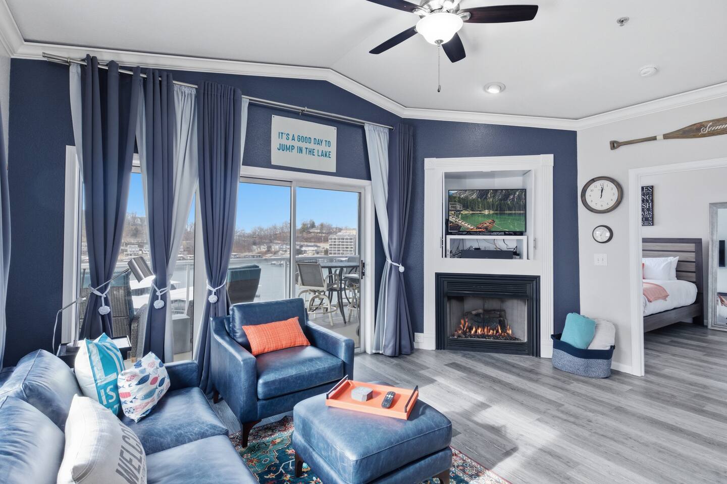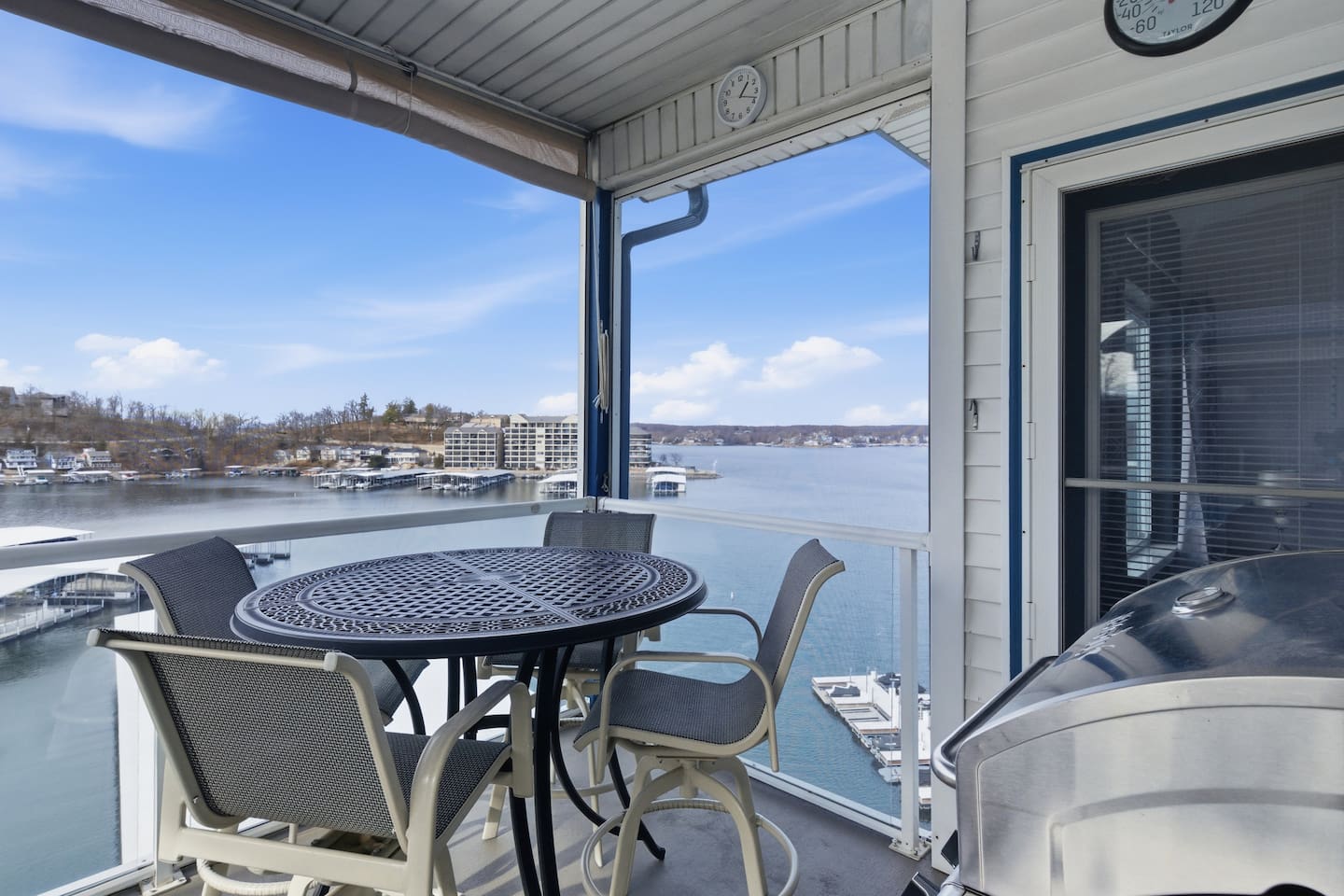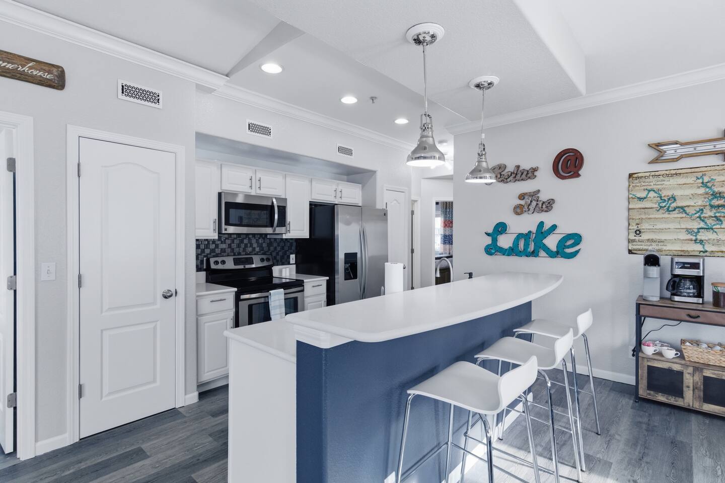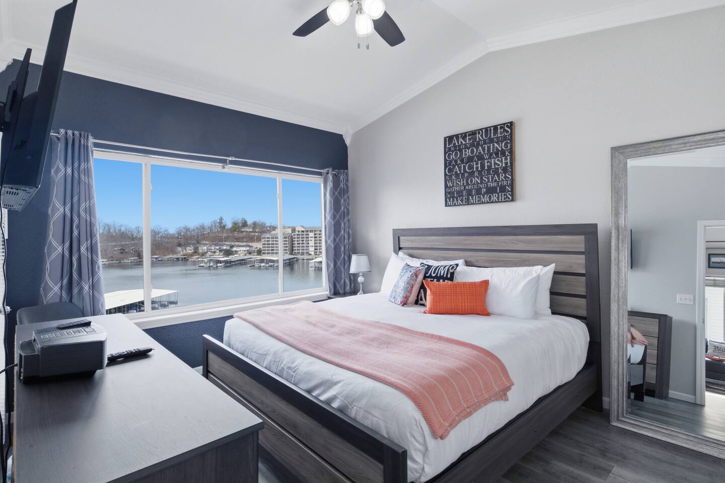 Welcome to The Royal View, a beautifully updated, top-level 3-bedroom, 2-bath condo offering expansive, unobstructed lake views, modern comfort, and no stairs. The elevator is conveniently located just outside the front door, making arrival easy and stress-free. Inside, the space feels bright, open, and welcoming, with the lake as your backdrop the moment you walk in. The gourmet kitchen features stainless steel appliances, beautiful Corian countertops, and all the essentials to cook at home. Coffee lovers will appreciate the fully stocked coffee bar with both drip and pod selections. The kitchen/dining area also offers comfortable bar seating—a great spot to gather, chat, enjoy meals, or unwind with drinks after a day on the lake. The living area with vaulted ceilings is thoughtfully furnished with a new leather sofa and chair, a smart TV, and a cozy gas fireplace—perfect for relaxing after a day on the water. The primary bedroom retreat features massive lake views, a king-size bed with a high-end mattress, a smart TV, and dresser, creating a comfortable and relaxing space to unwind. The beautifully updated en-suite bathroom includes a new spacious walk-in shower and a new vanity. The second and third bedrooms each offer queen beds, smart TVs, closets for your belongings, and stylish décor with brand-new mattresses, quality bedding, and thoughtful touches to ensure a restful stay. The second bathroom has also been recently remodeled and features a walk-in shower. Step outside onto the large screened-in patio, perfect for morning coffee or sunset cocktails without the bugs. The patio includes comfy wicker recliners, a large table, and a brand-new gas grill—all with unbeatable lake views. Guests also enjoy Monarch’s resort-style amenities: Three heated pools — all accessible by elevator Two hot tubs (Please note all pools and hot tubs are closed for the season. Will open in May) A beautifully lit ½-mile waterfront boardwalk Additional BBQ grills near the pools High-speed internet for streaming or working remotely Located near Mile Marker 2 and just 10 minutes from the Bagnell Dam Strip, you’ll be close to dining, shopping, and lake attractions—while still enjoying a peaceful lakefront setting. Whether you’re planning a family vacation, a relaxing getaway, or a work-from-the-lake escape, The Royal View offers the perfect blend of luxury, comfort, and unforgettable views. We can’t wait to host you! PLEASE NOTE: No pets allowed and no smoking of any kind are permitted. A minimum fee of $250 will be applied for violation of these rules.