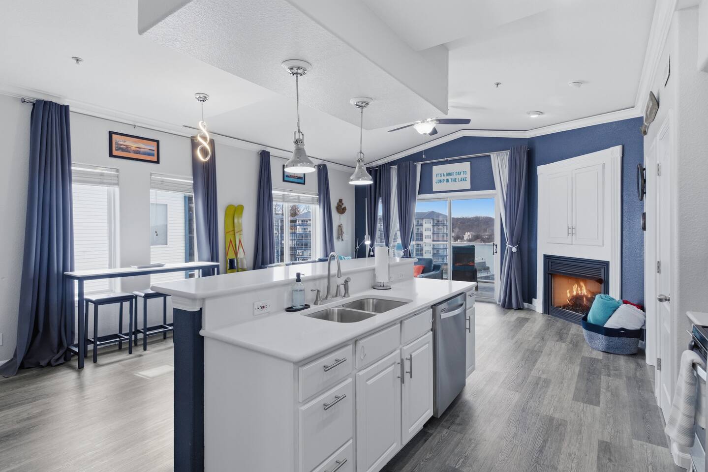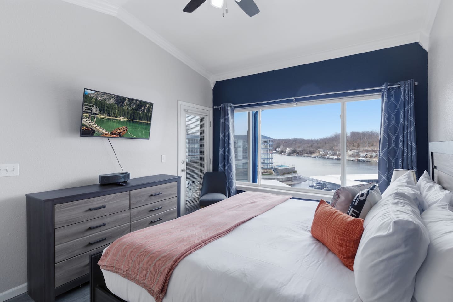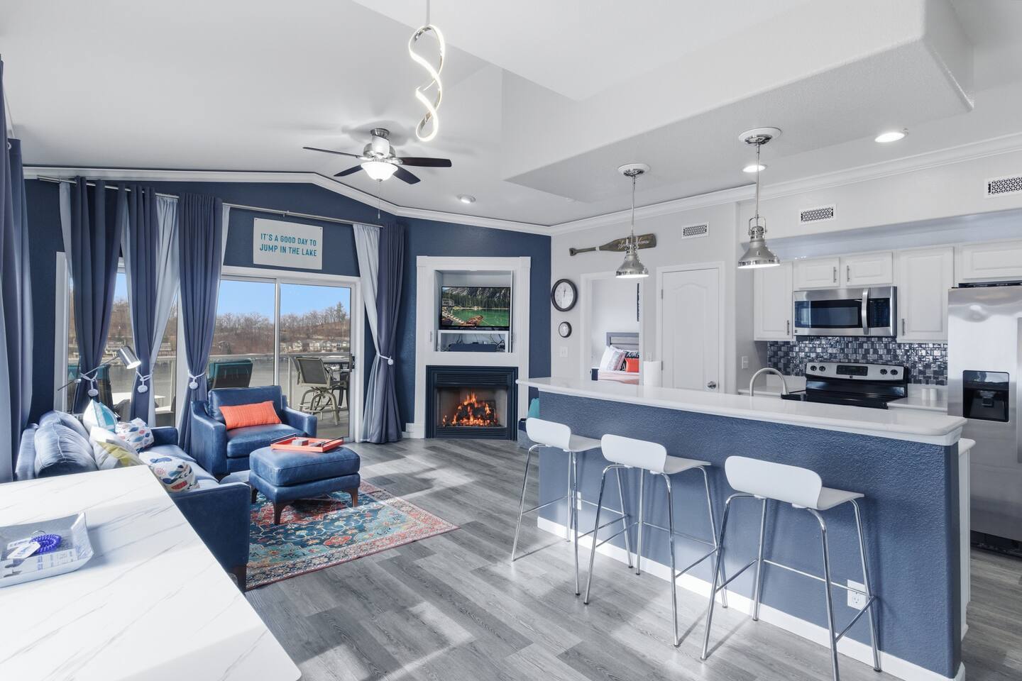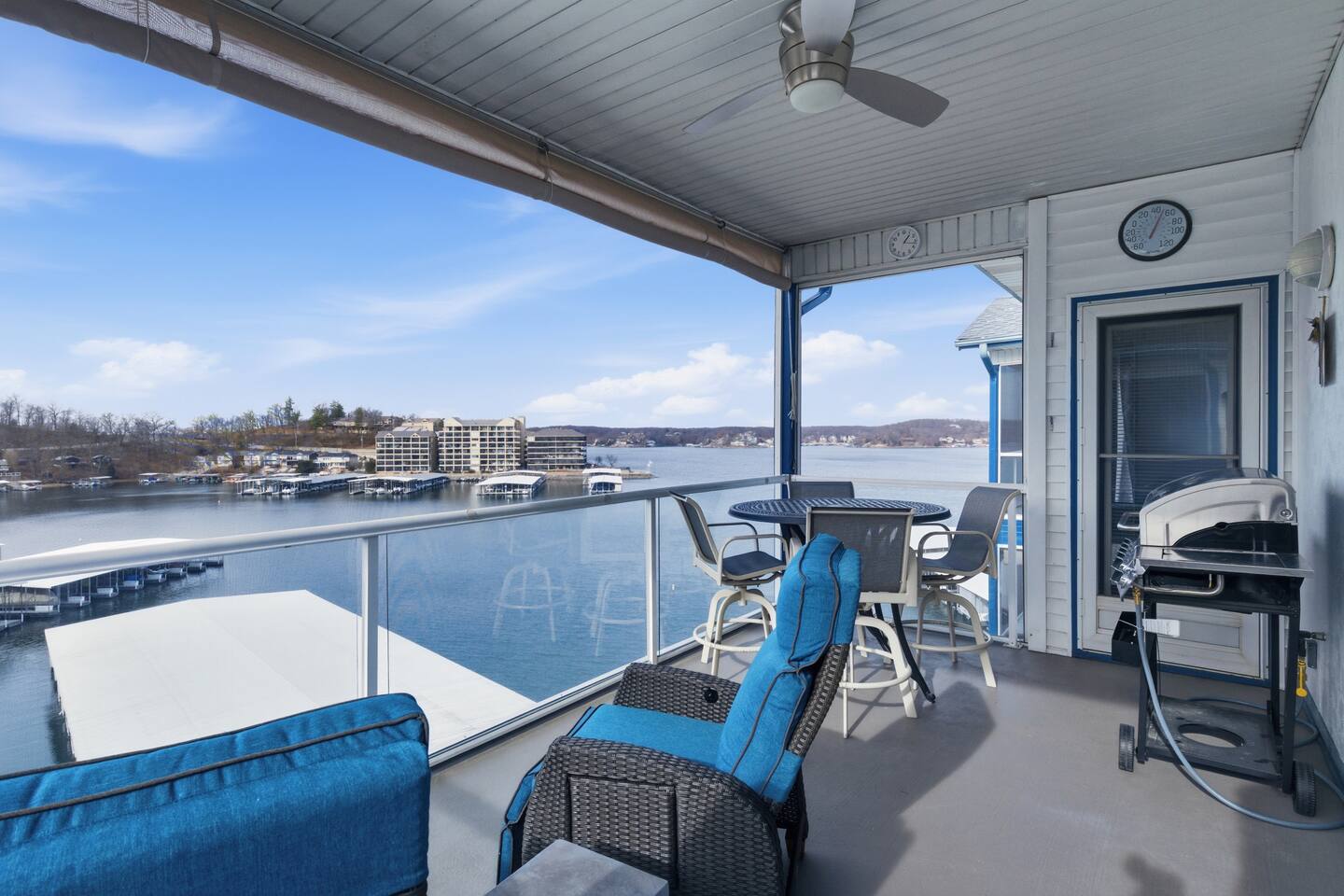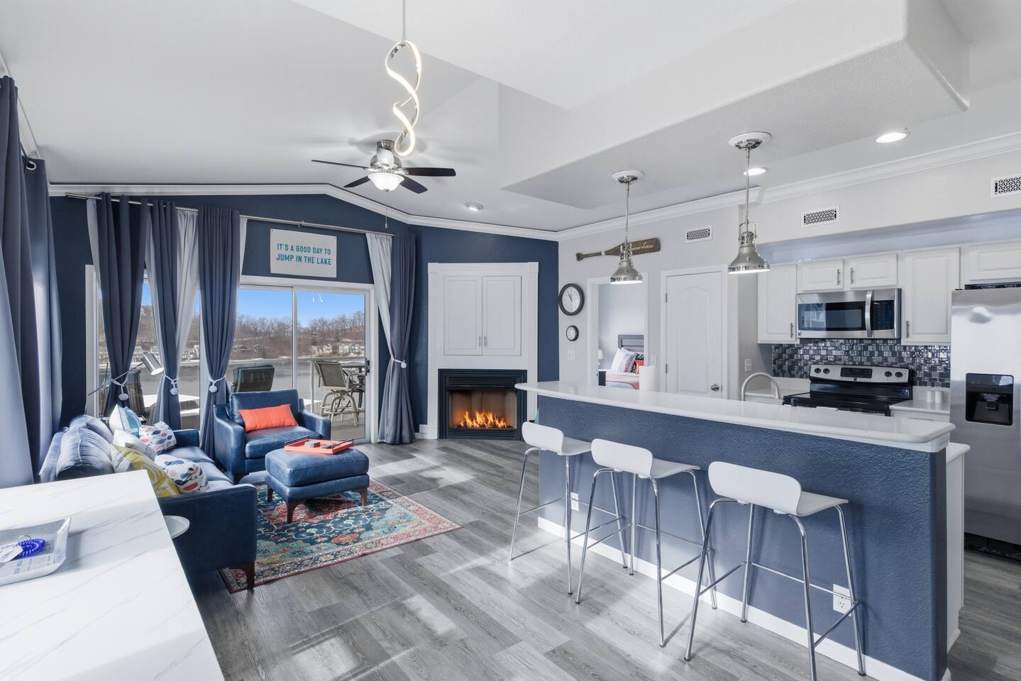 Welcome to The Royal View, a beautifully updated, top-level 3-bedroom, 2-bath condo offering expansive, unobstructed lake views, modern comfort, and no stairs. The elevator is conveniently located just outside the front door, making arrival easy and stress-free. Inside, the space feels bright, open, and welcoming, with the lake as your backdrop the moment you walk in. The gourmet kitchen features stainless steel appliances, beautiful Corian countertops, and all the essentials to cook at home. Coffee lovers will appreciate the fully stocked coffee bar with both drip and pod selections. The kitchen/dining area also offers comfortable bar seating—a great spot to gather, chat, enjoy meals, or unwind with drinks after a day on the lake. The living area with vaulted ceilings is thoughtfully furnished with a new leather sofa and chair, a smart TV, and a cozy gas fireplace—perfect for relaxing after a day on the water. The primary bedroom retreat features massive lake views, a king-size bed with a high-end mattress, a smart TV, and dresser, creating a comfortable and relaxing space to unwind. The beautifully updated en-suite bathroom includes a new spacious walk-in shower and a new vanity. The second and third bedrooms each offer queen beds, smart TVs, closets for your belongings, and stylish décor with brand-new mattresses, quality bedding, and thoughtful touches to ensure a restful stay. The second bathroom has also been recently remodeled and features a walk-in shower. Step outside onto the large screened-in patio, perfect for morning coffee or sunset cocktails without the bugs. The patio includes comfy wicker recliners, a large table, and a brand-new gas grill—all with unbeatable lake views. Guests also enjoy Monarch’s resort-style amenities: Three heated pools — all accessible by elevator Two hot tubs (Please note all pools and hot tubs are closed for the season. Will open in May) A beautifully lit ½-mile waterfront boardwalk Additional BBQ grills near the pools High-speed internet for streaming or working remotely Located near Mile Marker 2 and just 10 minutes from the Bagnell Dam Strip, you’ll be close to dining, shopping, and lake attractions—while still enjoying a peaceful lakefront setting. Whether you’re planning a family vacation, a relaxing getaway, or a work-from-the-lake escape, The Royal View offers the perfect blend of luxury, comfort, and unforgettable views. We can’t wait to host you! PLEASE NOTE: No pets allowed and no smoking of any kind are permitted. A minimum fee of $250 will be applied for violation of these rules.