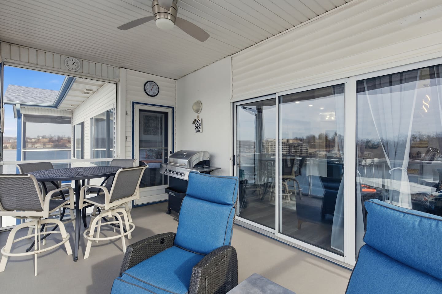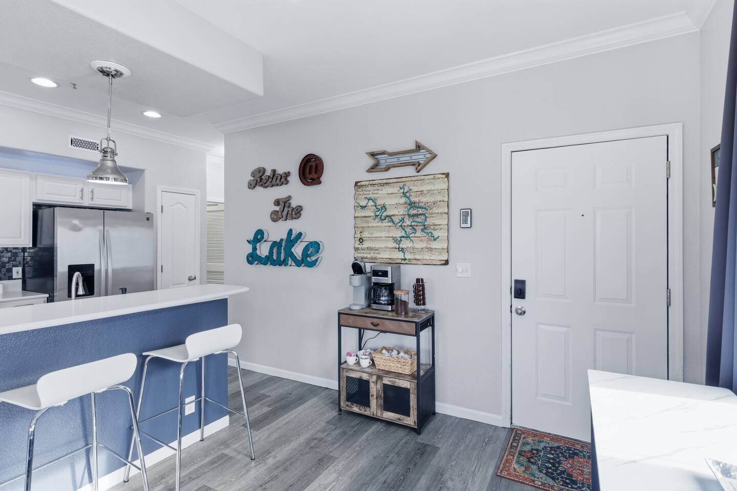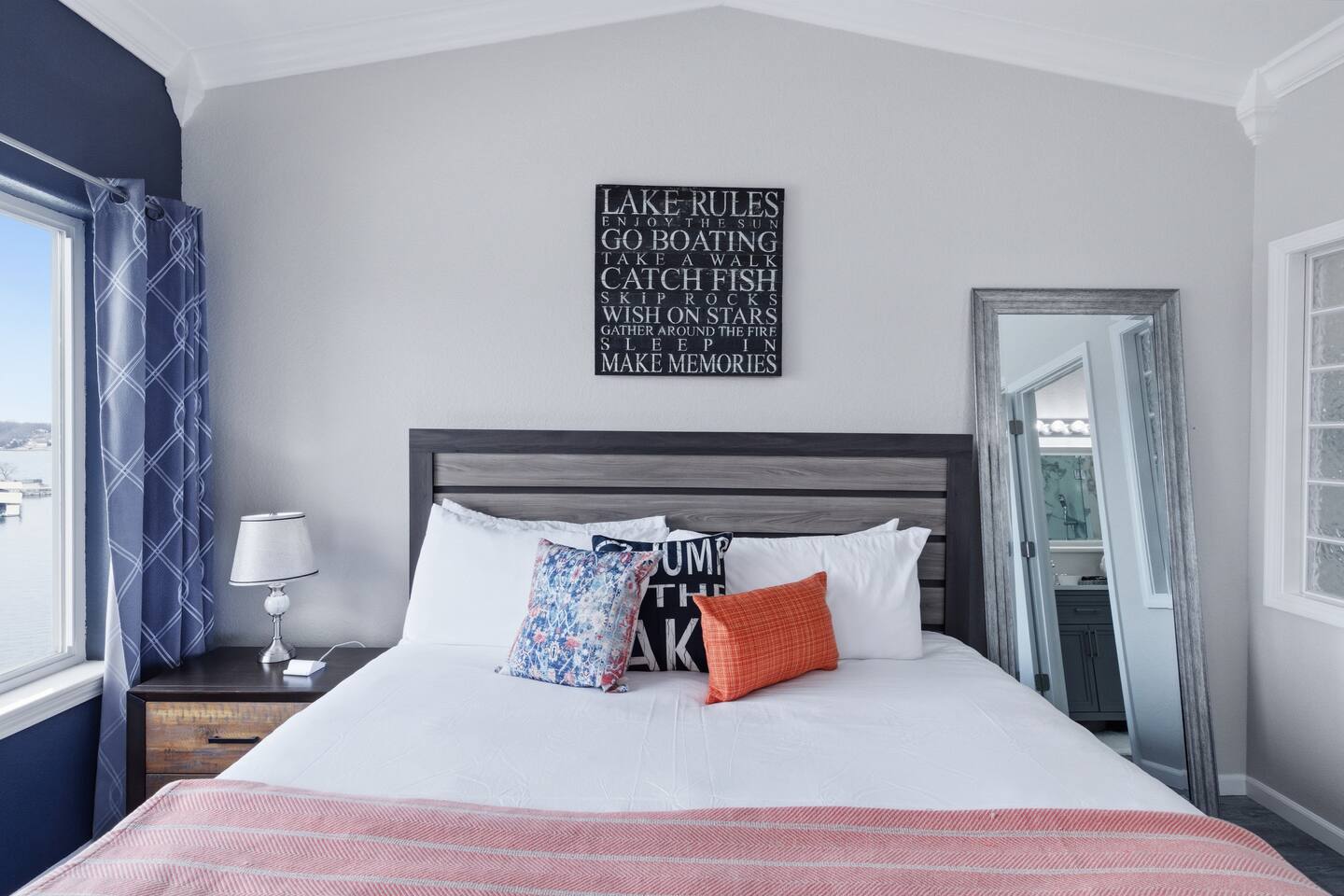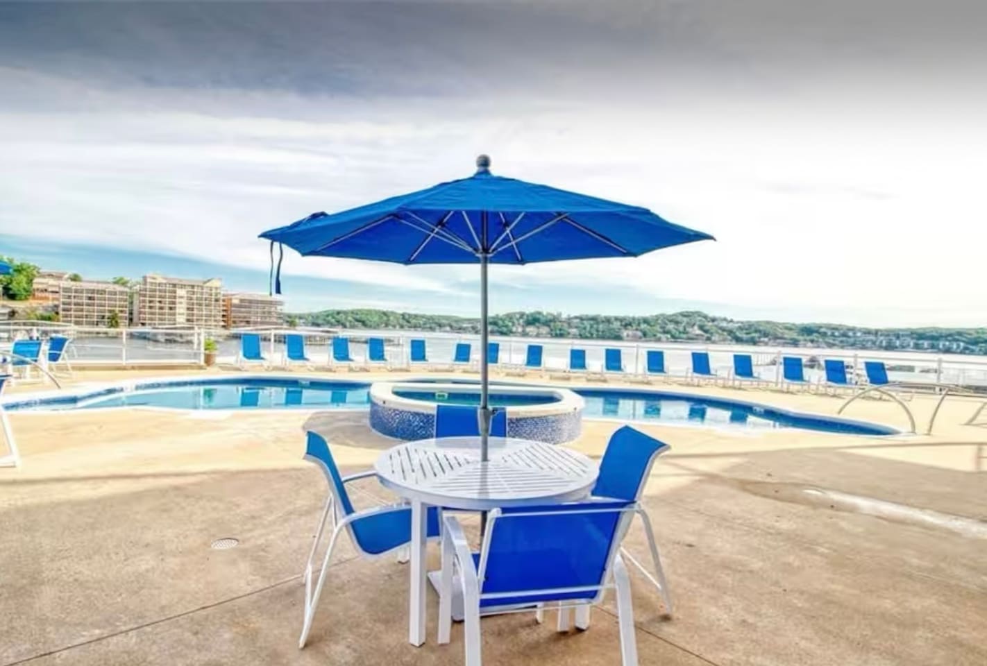 Welcome to The Royal View, a beautifully updated, top-level 3-bedroom, 2-bath condo offering expansive, unobstructed lake views, modern comfort, and no stairs. The elevator is conveniently located just outside the front door, making arrival easy and stress-free. Inside, the space feels bright, open, and welcoming, with the lake as your backdrop the moment you walk in. The gourmet kitchen features stainless steel appliances, beautiful Corian countertops, and all the essentials to cook at home. Coffee lovers will appreciate the fully stocked coffee bar with both drip and pod selections. The kitchen/dining area also offers comfortable bar seating—a great spot to gather, chat, enjoy meals, or unwind with drinks after a day on the lake. The living area with vaulted ceilings is thoughtfully furnished with a new leather sofa and chair, a smart TV, and a cozy gas fireplace—perfect for relaxing after a day on the water. The primary bedroom retreat features massive lake views, a king-size bed with a high-end mattress, a smart TV, and dresser, creating a comfortable and relaxing space to unwind. The beautifully updated en-suite bathroom includes a new spacious walk-in shower and a new vanity. The second and third bedrooms each offer queen beds, smart TVs, closets for your belongings, and stylish décor with brand-new mattresses, quality bedding, and thoughtful touches to ensure a restful stay. The second bathroom has also been recently remodeled and features a walk-in shower. Step outside onto the large screened-in patio, perfect for morning coffee or sunset cocktails without the bugs. The patio includes comfy wicker recliners, a large table, and a brand-new gas grill—all with unbeatable lake views. Guests also enjoy Monarch’s resort-style amenities: Three heated pools — all accessible by elevator Two hot tubs (Please note all pools and hot tubs are closed for the season. Will open in May) A beautifully lit ½-mile waterfront boardwalk Additional BBQ grills near the pools High-speed internet for streaming or working remotely Located near Mile Marker 2 and just 10 minutes from the Bagnell Dam Strip, you’ll be close to dining, shopping, and lake attractions—while still enjoying a peaceful lakefront setting. Whether you’re planning a family vacation, a relaxing getaway, or a work-from-the-lake escape, The Royal View offers the perfect blend of luxury, comfort, and unforgettable views. We can’t wait to host you! PLEASE NOTE: No pets allowed and no smoking of any kind are permitted. A minimum fee of $250 will be applied for violation of these rules.