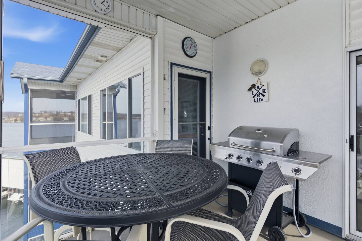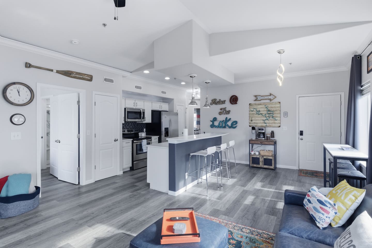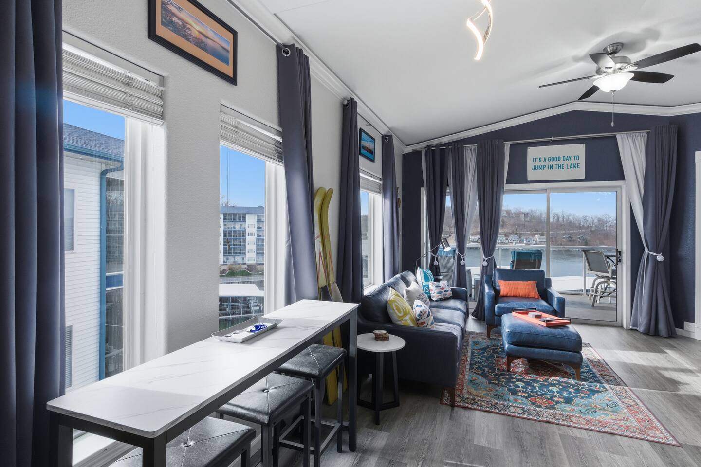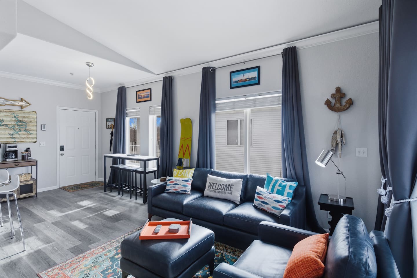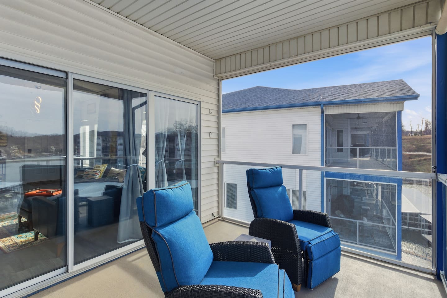 Welcome to The Royal View, a beautifully updated, top-level 3-bedroom, 2-bath condo offering expansive, unobstructed lake views, modern comfort, and no stairs. The elevator is conveniently located just outside the front door, making arrival easy and stress-free. Inside, the space feels bright, open, and welcoming, with the lake as your backdrop the moment you walk in. The gourmet kitchen features stainless steel appliances, beautiful Corian countertops, and all the essentials to cook at home. Coffee lovers will appreciate the fully stocked coffee bar with both drip and pod selections. The kitchen/dining area also offers comfortable bar seating—a great spot to gather, chat, enjoy meals, or unwind with drinks after a day on the lake. The living area with vaulted ceilings is thoughtfully furnished with a new leather sofa and chair, a smart TV, and a cozy gas fireplace—perfect for relaxing after a day on the water. The primary bedroom retreat features massive lake views, a king-size bed with a high-end mattress, a smart TV, and dresser, creating a comfortable and relaxing space to unwind. The beautifully updated en-suite bathroom includes a new spacious walk-in shower and a new vanity. The second and third bedrooms each offer queen beds, smart TVs, closets for your belongings, and stylish décor with brand-new mattresses, quality bedding, and thoughtful touches to ensure a restful stay. The second bathroom has also been recently remodeled and features a walk-in shower. Step outside onto the large screened-in patio, perfect for morning coffee or sunset cocktails without the bugs. The patio includes comfy wicker recliners, a large table, and a brand-new gas grill—all with unbeatable lake views. Guests also enjoy Monarch’s resort-style amenities: Three heated pools — all accessible by elevator Two hot tubs (Please note all pools and hot tubs are closed for the season. Will open in May) A beautifully lit ½-mile waterfront boardwalk Additional BBQ grills near the pools High-speed internet for streaming or working remotely Located near Mile Marker 2 and just 10 minutes from the Bagnell Dam Strip, you’ll be close to dining, shopping, and lake attractions—while still enjoying a peaceful lakefront setting. Whether you’re planning a family vacation, a relaxing getaway, or a work-from-the-lake escape, The Royal View offers the perfect blend of luxury, comfort, and unforgettable views. We can’t wait to host you! PLEASE NOTE: No pets allowed and no smoking of any kind are permitted. A minimum fee of $250 will be applied for violation of these rules.